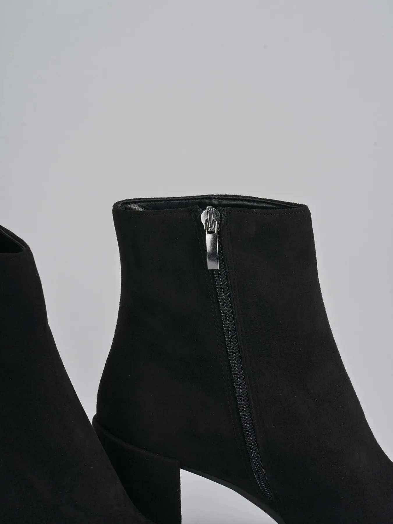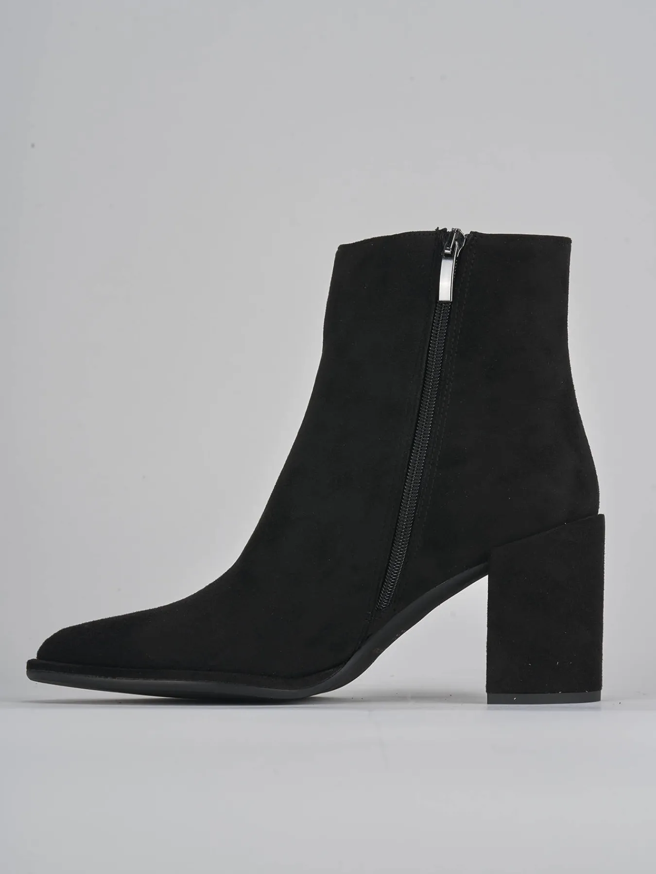 stivaletto tacco 8 cm fondo in leggera gomma e soletto interno in vera pelle. tomaia in morbido camoscio, punta sfilata, comoda cerniera laterale, tacco grosso e guardolo sporgente per un look fierce.