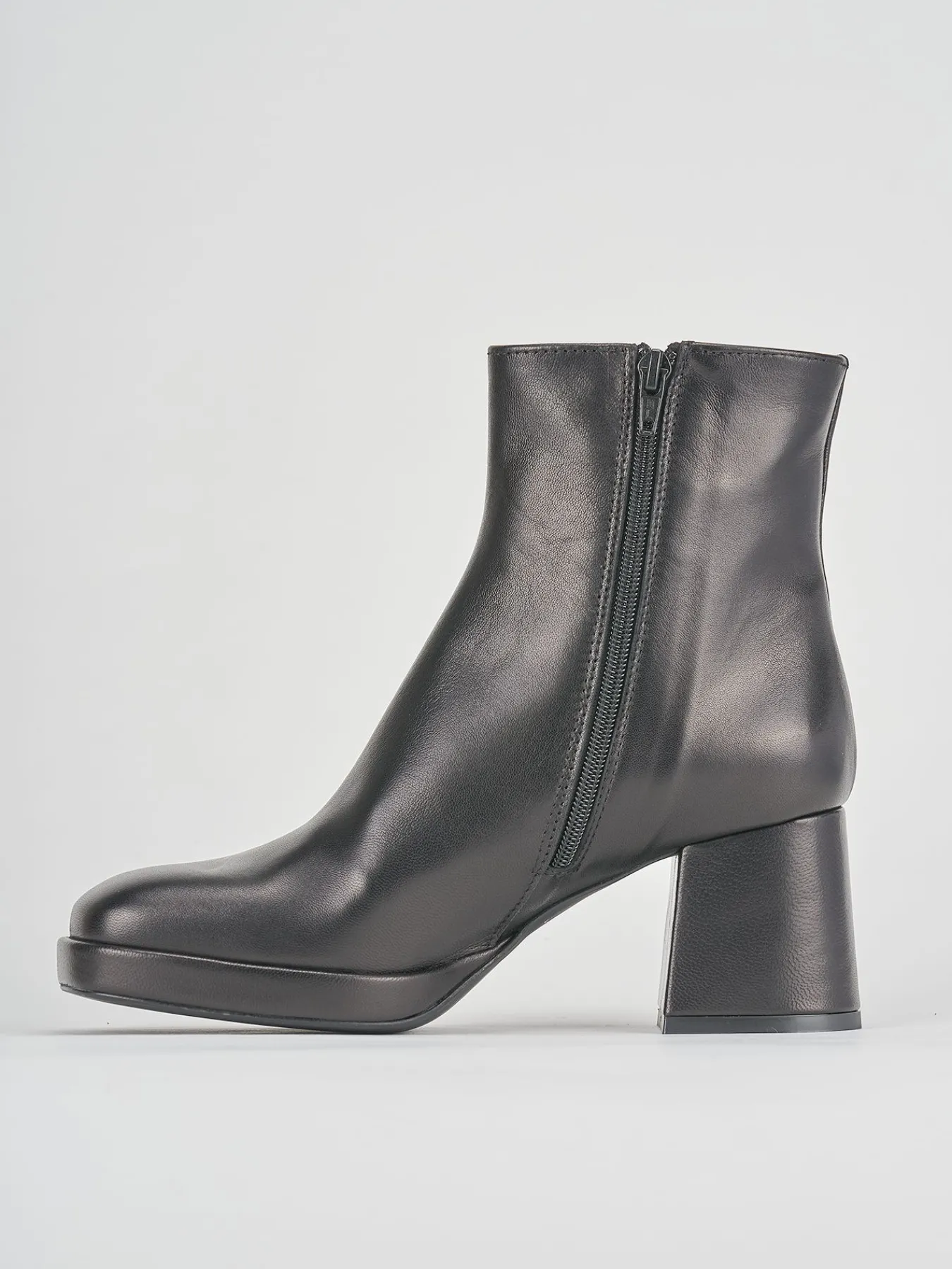 Stivaletto tacco 5 cm, fondo gomma e soletto interno in vera pelle. tomaia in morbida pelle, tacco grosso e squadrato, cinturino in caviglia e platform in punta di 2 cm per un look rock cool.