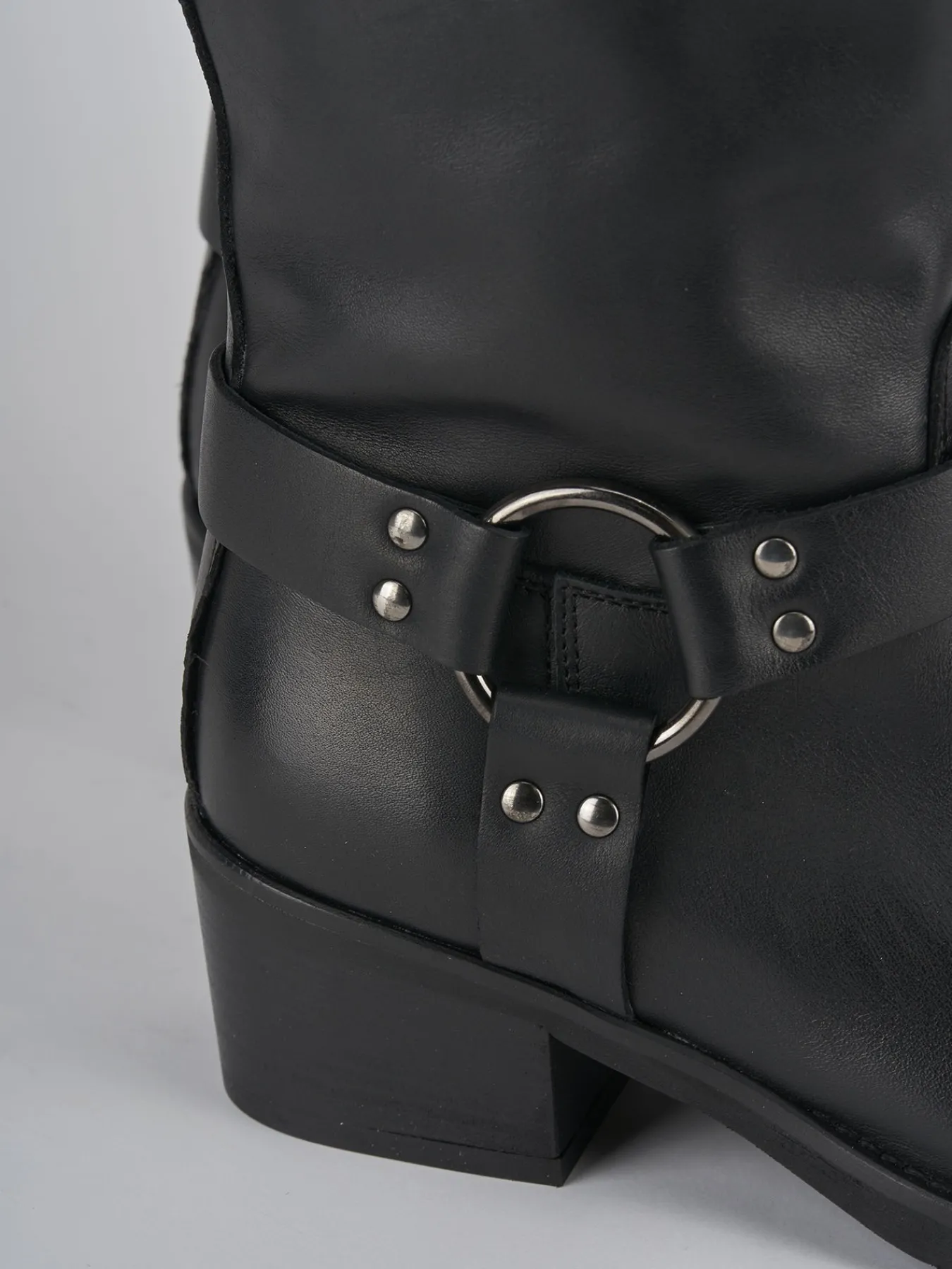 Stivale biker tacco 4 cm fondo in gomma e soletto interno in vera pelle. Tomaia in morbida pelle, punta leggermente squadrata, ghette, cerniera laterale, altezza gambale a tre quarti polpaccio, accessorio ad anello che riunisce tre fascette al livello della caviglia e tacco grosso per un look adatto ad ogni occasione.