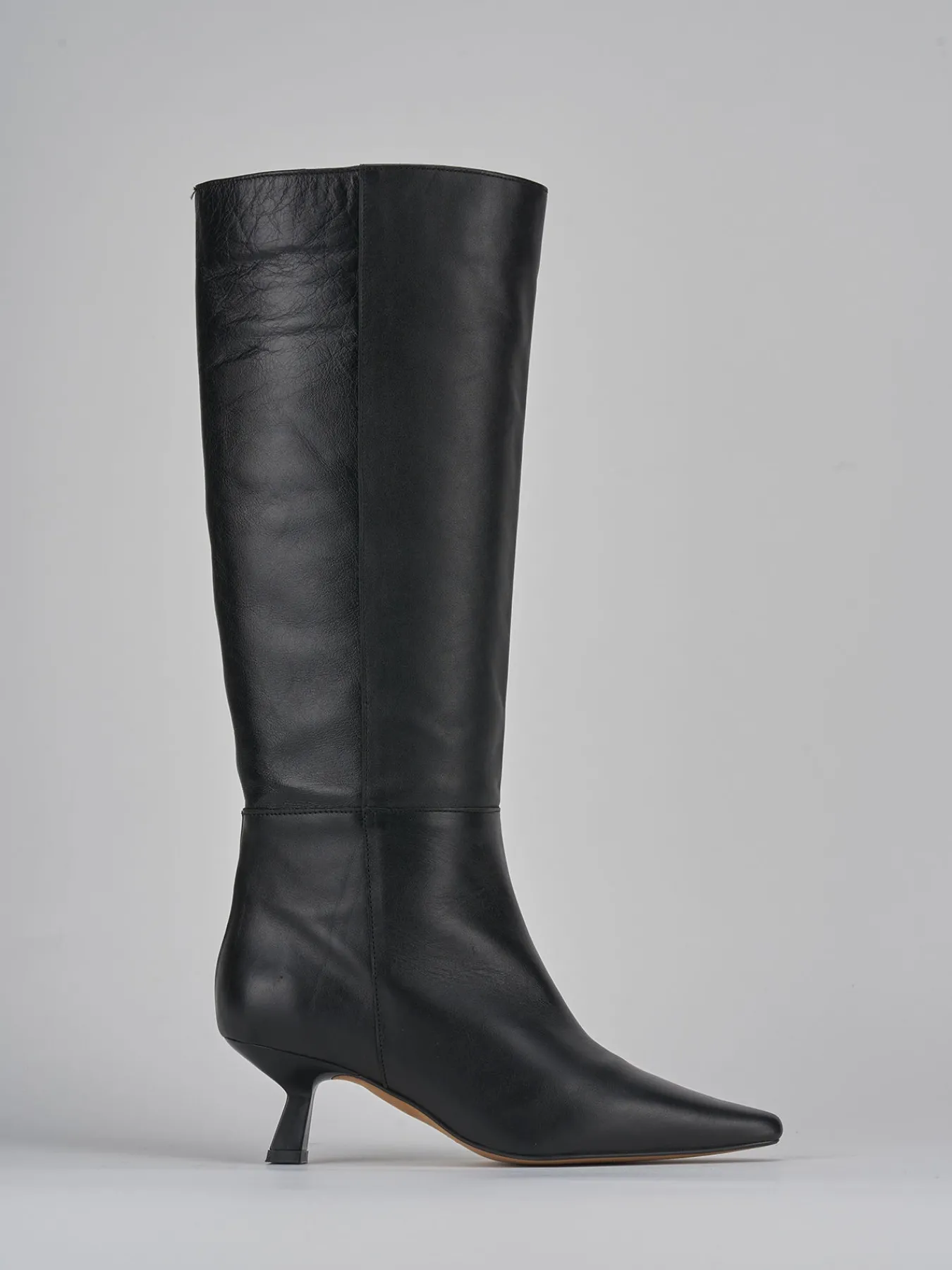 Stivale tacco 5 cm fondo in leggera gomma e soletto interno in vera pelle. tomaia in morbida pelle, punta sfilata, cuciture a mano, gambale ampio tubolare che arriva fino a sotto il ginocchio e nuovissimo tacco rocchetto. perfetto per le tue serate più speciali.