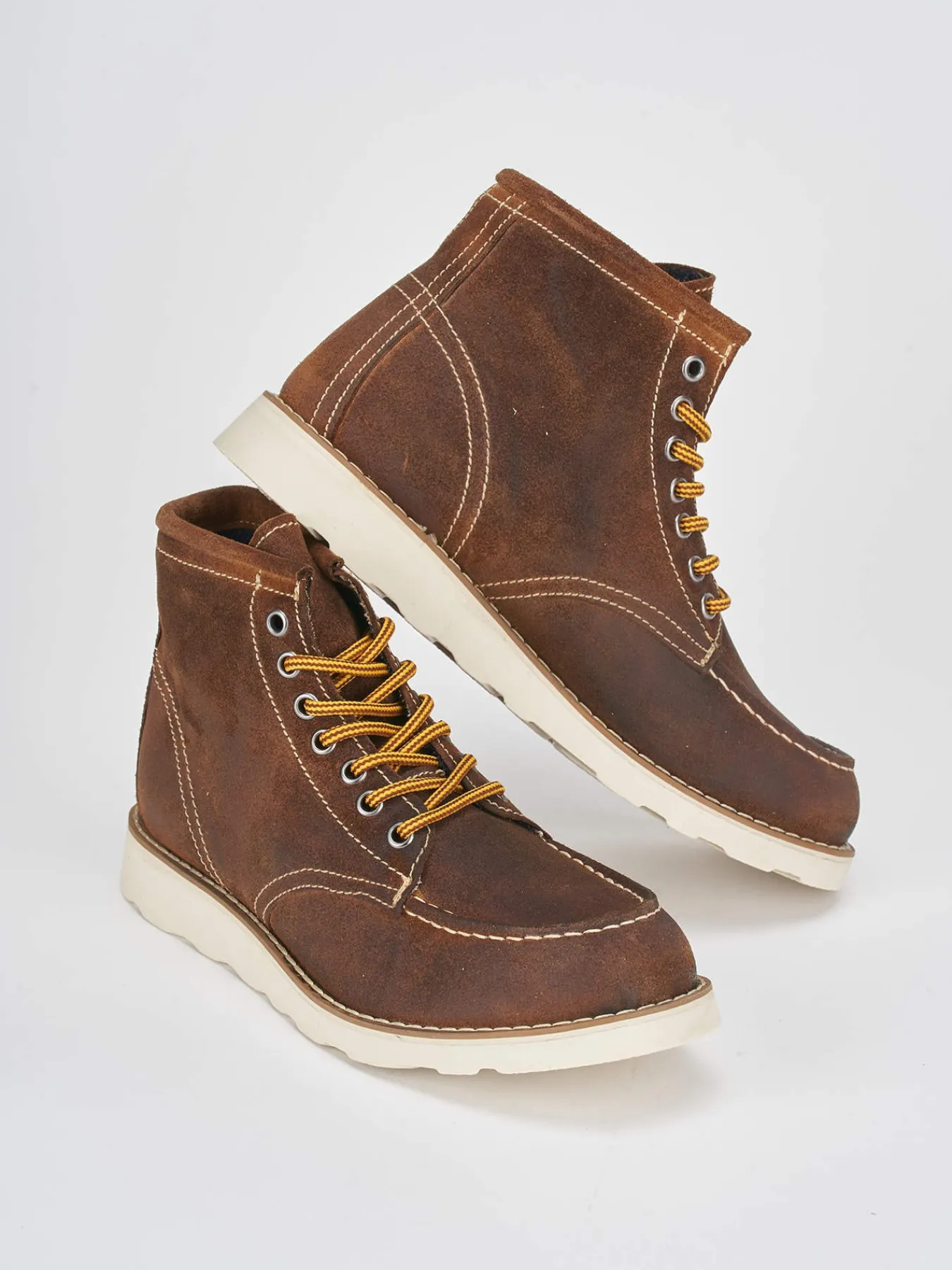 La tomaia in morbido camoscio assicura un comfort eccezionale, mentre la punta tonda e le cuciture ben visibili aggiungono un tocco di carattere.