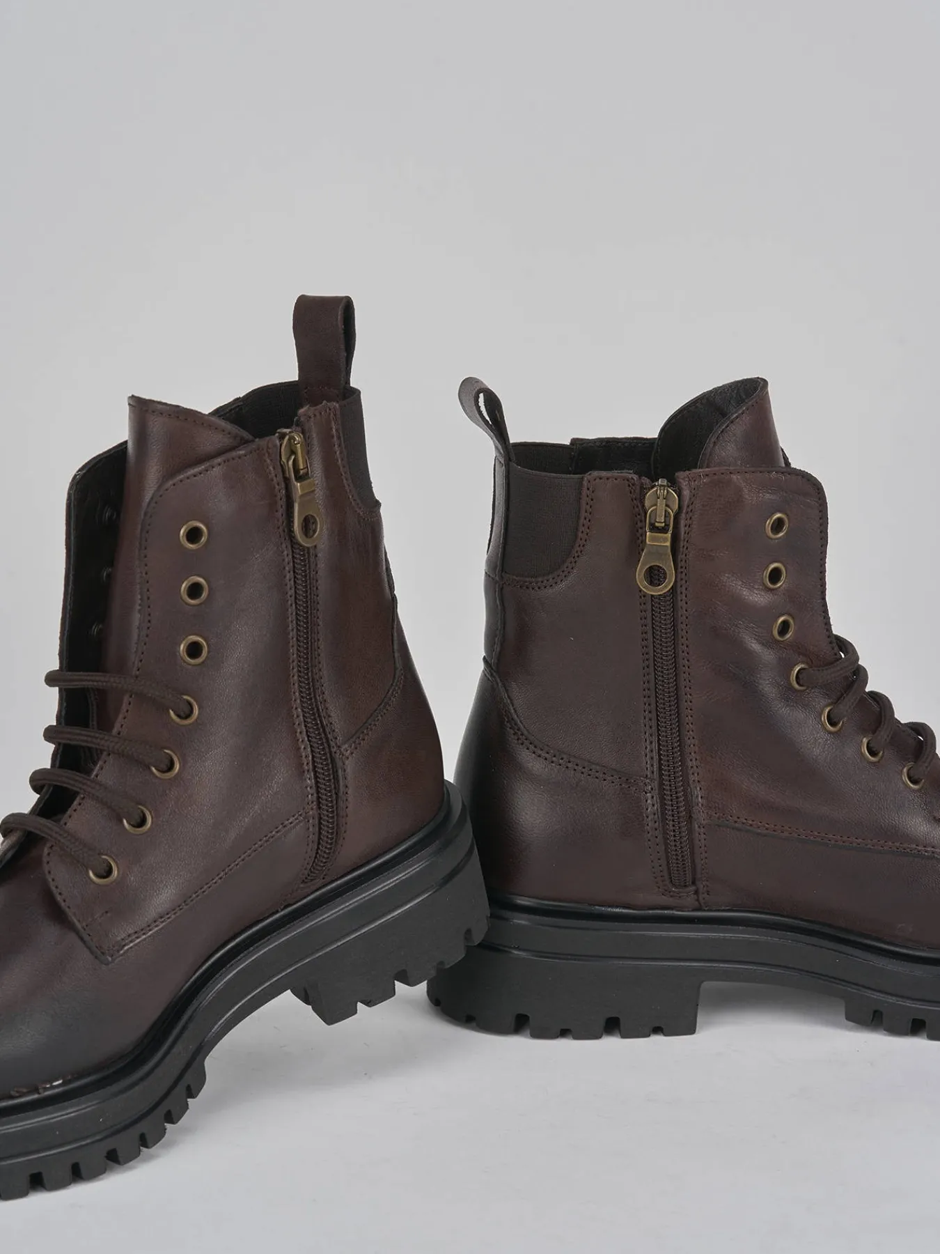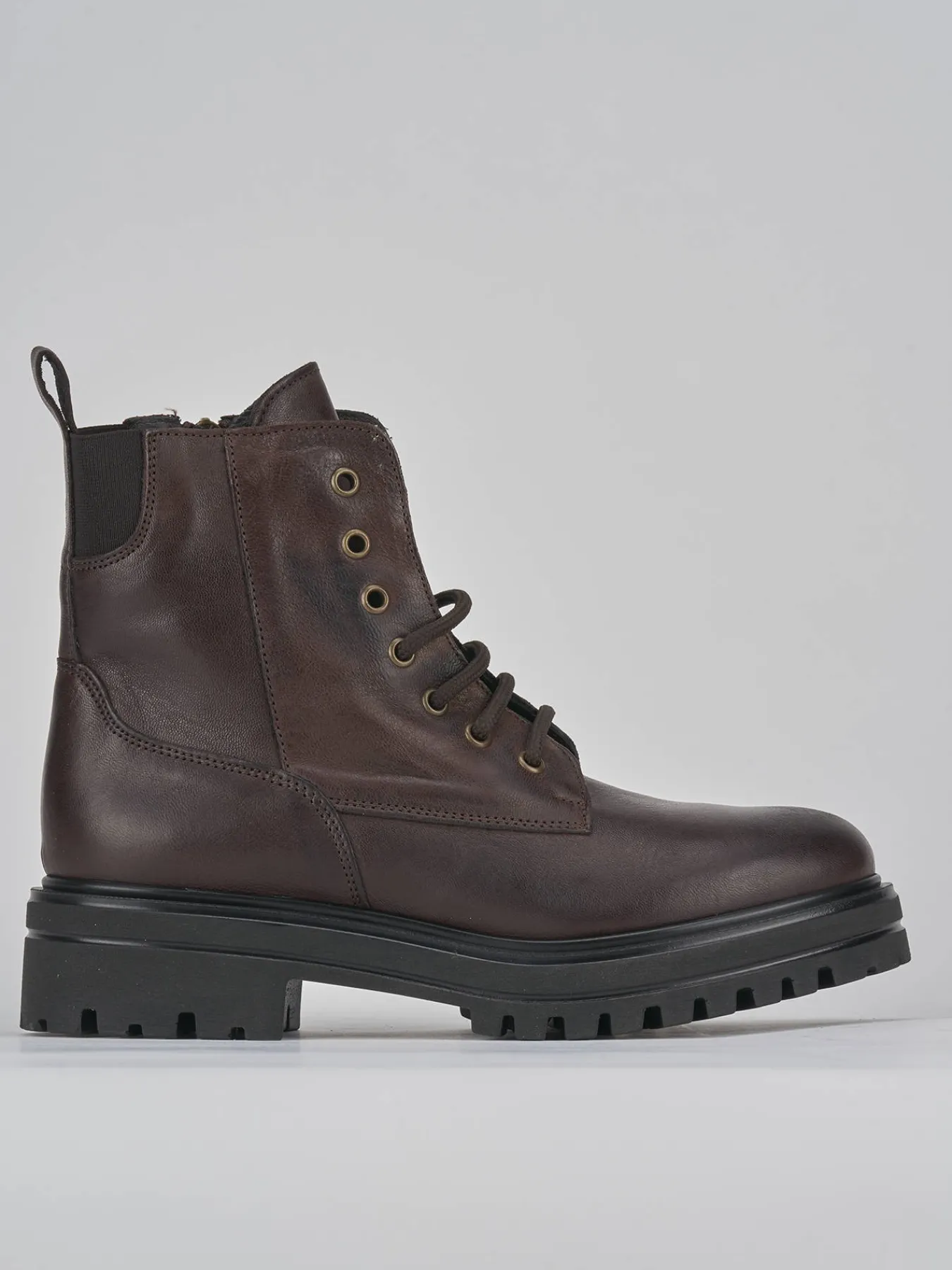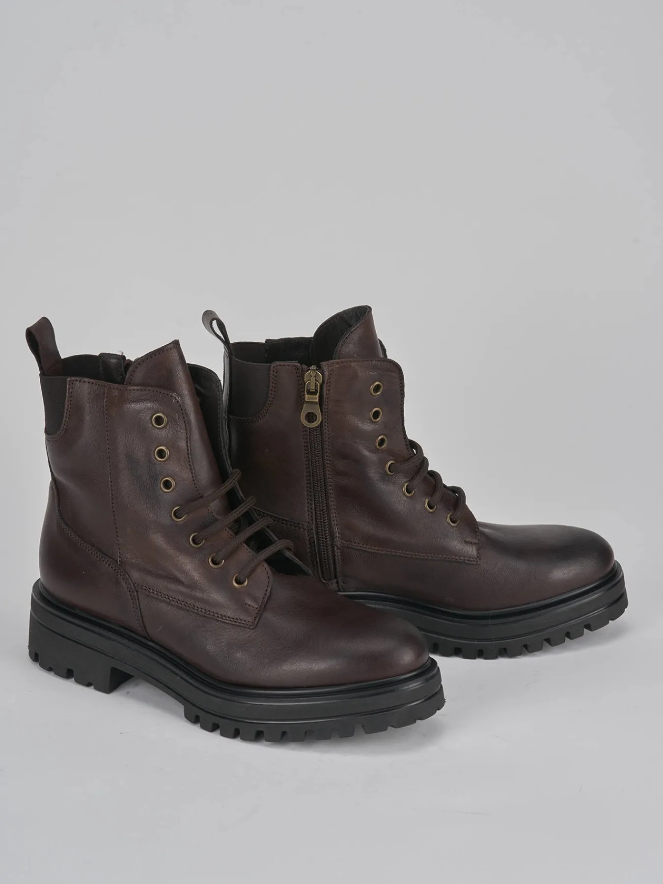 Anfibio fondo in gomma carrarmato 3cm e soletto interno in vera pelle. Tomaia in morbida pelle, punta tonda, lace e allacciatura su tutto il collo del piede con occhielli in metallo e comoda cerniera laterale per un look cool.
