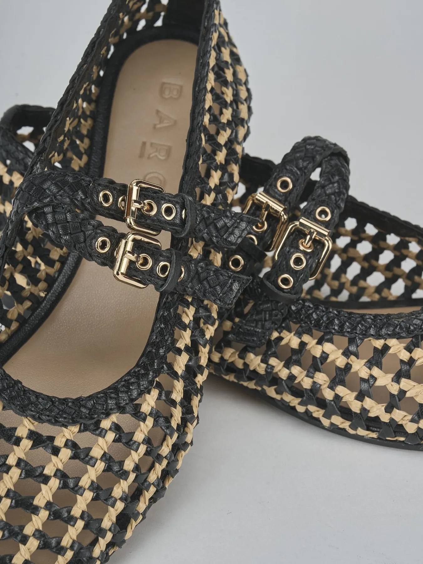 La tomaia presenta un intreccio bicolore nero e naturale, creando un effetto visivo accattivante e sofisticato.