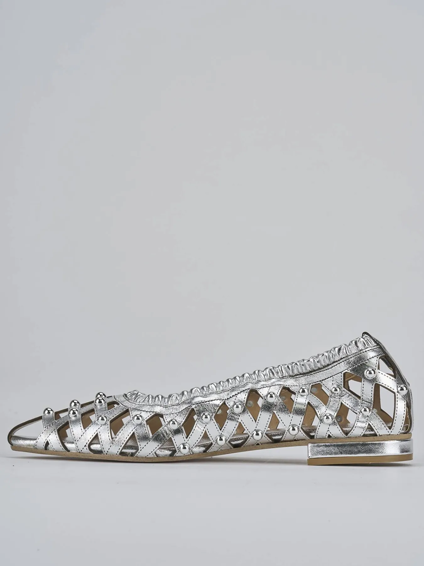 Ballerina tacco 2 cm, fondo in cuoio e soletto interno in vera pelle. Tomaia in morbida pelle, punta sfilata, traforata con borchie ed elastico per una comoda calzata.