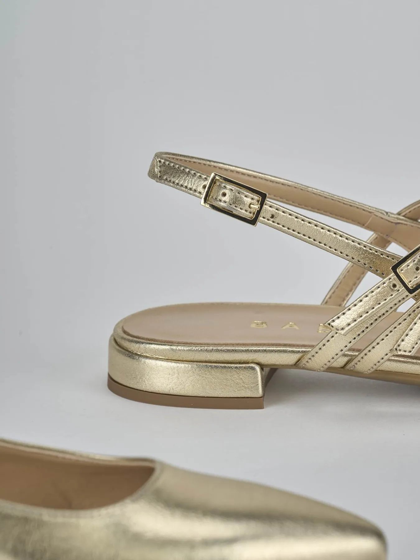 Ballerina tacco 2 cm fondo in leggerissima gomma e soletto interno in vera pelle. Tomaia in morbida pelle laminata, punta sfilata, scollo leggermente squadrato, due cinturini sul collo del piede e uno sul tallone con fibbia regolabile per un look semplice.
