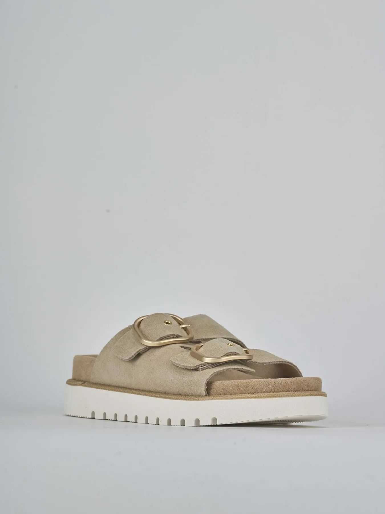 Realizzate in morbido camoscio, queste ciabatte presentano una punta affusolata e due grandi fasce con fibbia regolabile sul collo del piede, offrendo una calzata personalizzabile e sicura.