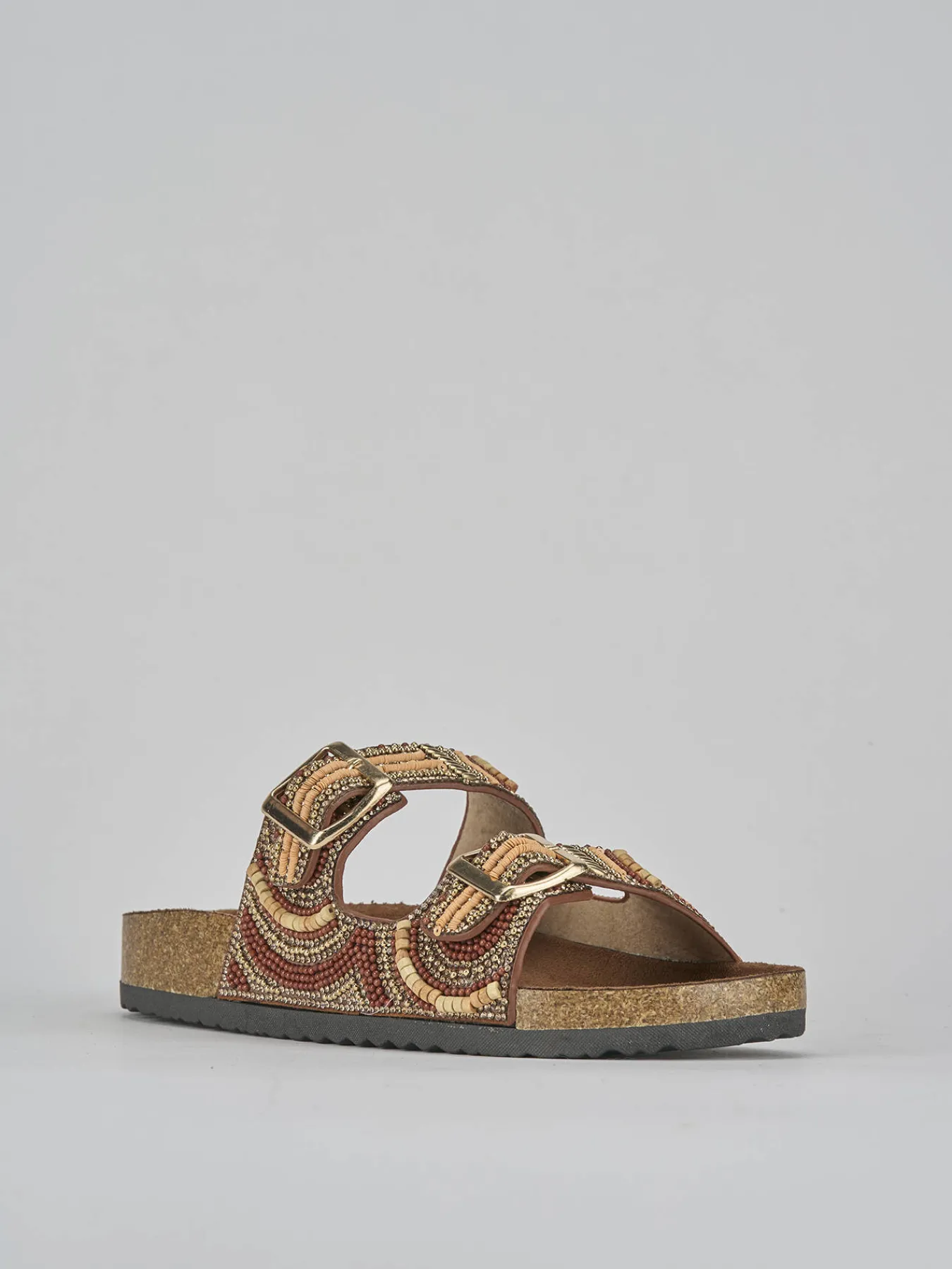 Realizzate in pelle bronzo, queste ciabatte presentano una lavorazione unica con mini borchie, strass e perline che aggiungono un tocco di raffinatezza.