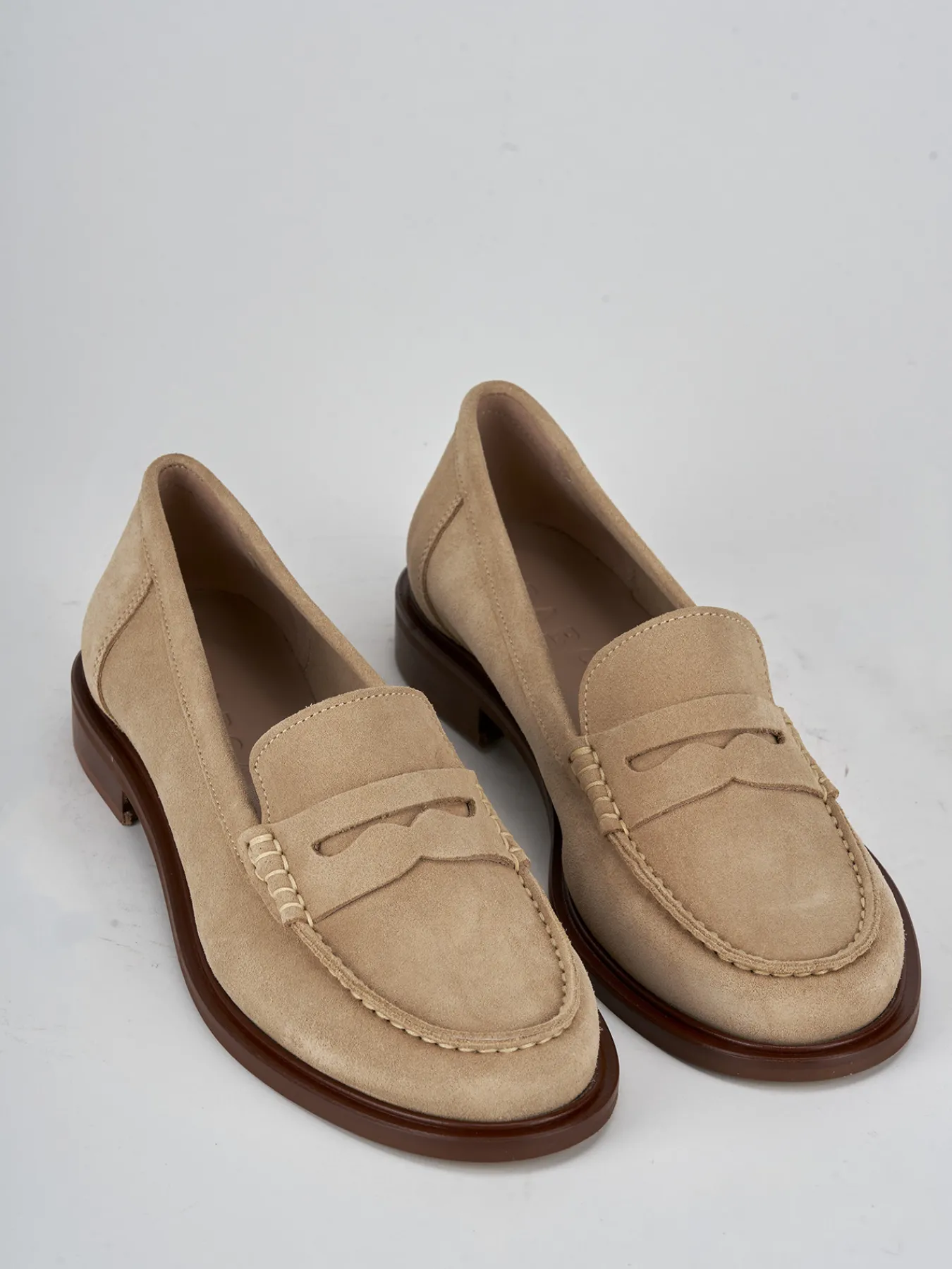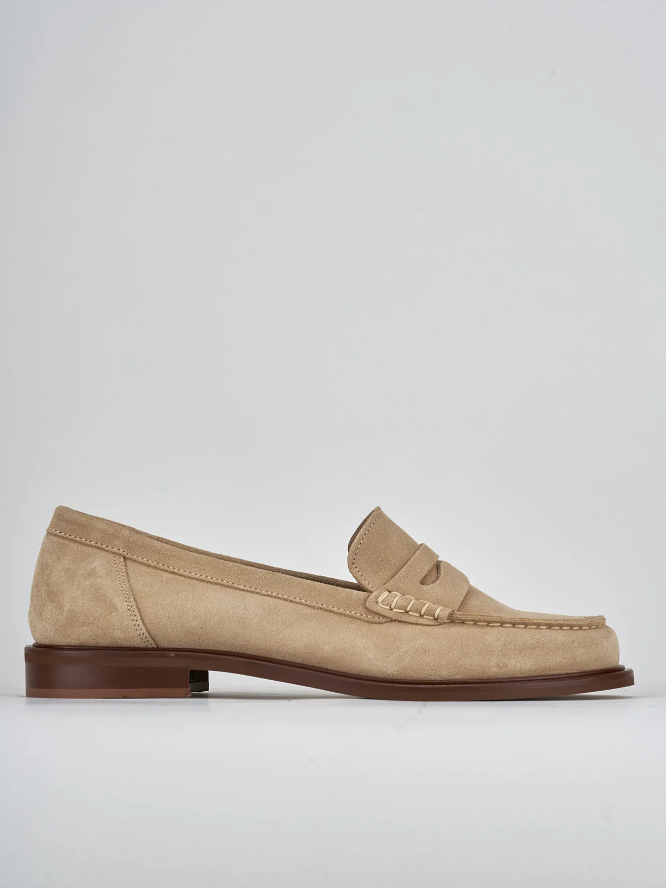Mocassino tacco 2 cm fondo in leggera gomma e soletto interno in vera pelle. tomaia in morbido camoscio, punta leggermente squadrata, cuciture a mano e in rilievo, mascherina a bocca di leone. Dal design semplice per un look sempre attuale.