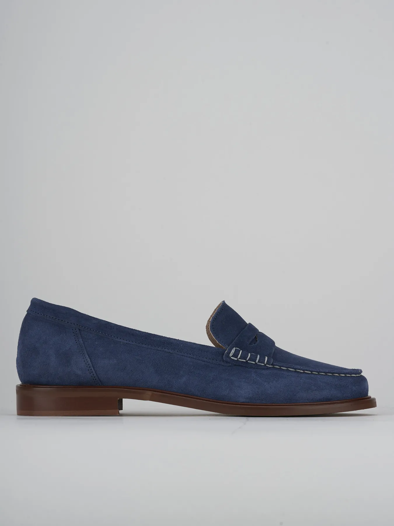 Mocassino tacco 2 cm fondo in leggera gomma e soletto interno in vera pelle. tomaia in morbido camoscio, punta leggermente squadrata, cuciture a mano e in rilievo, mascherina a bocca di leone. Dal design semplice per un look sempre attuale.