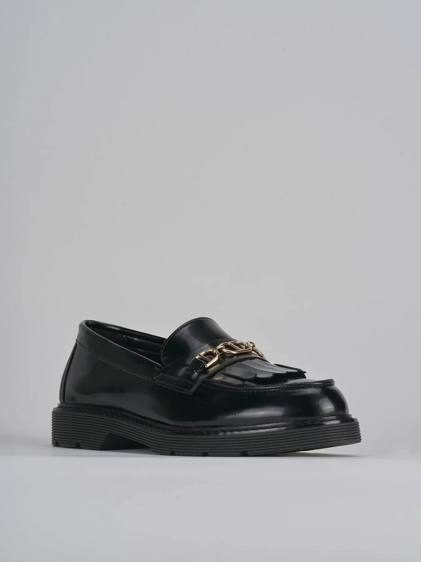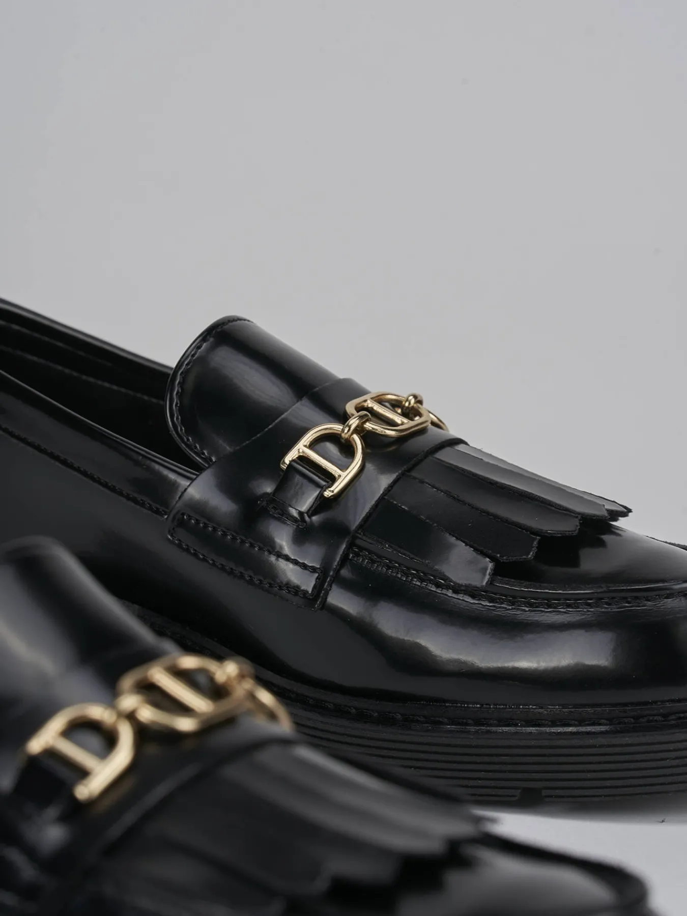 mocassino tacco 2 cm fondo in gomma e soletto interno in vera pelle. tomaia in morbida pelle abrasivata, punta leggermente squadrata, cuciture visibili, accessorio in metallo, frange per un look chic.