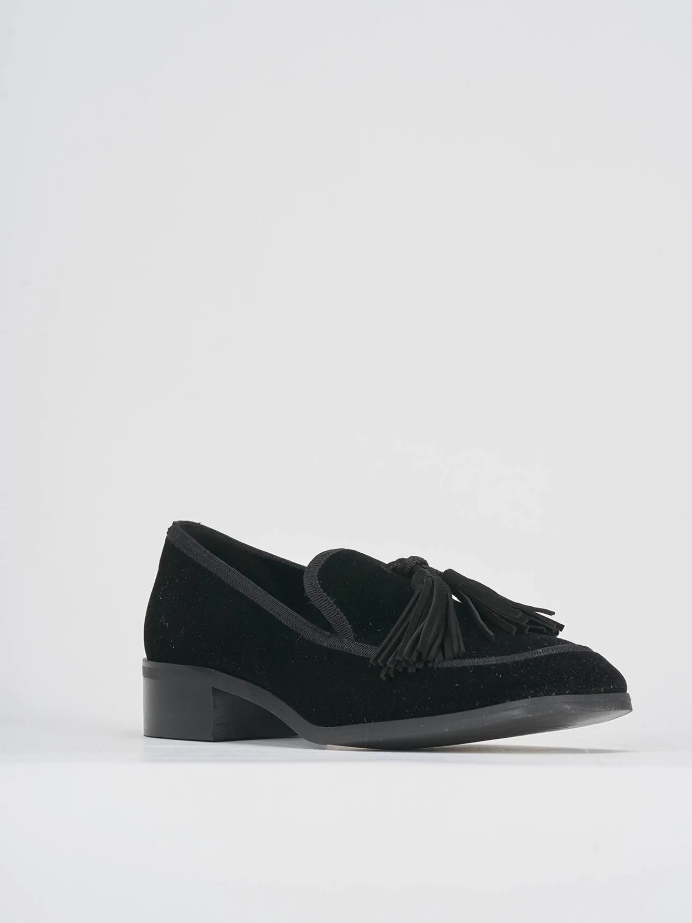 Mocassino tacco 2 cm fondo in gomma e soletto interno in vera pelle. Tomaia in morbido velluto, punta leggermente squadrata, cuciture visibili in tessuto grosso, nappine e tacco grosso per un look di classe.