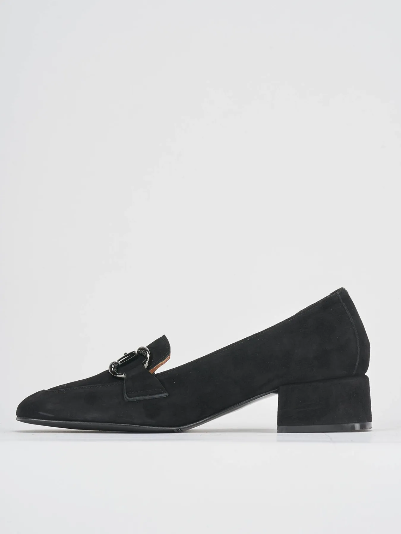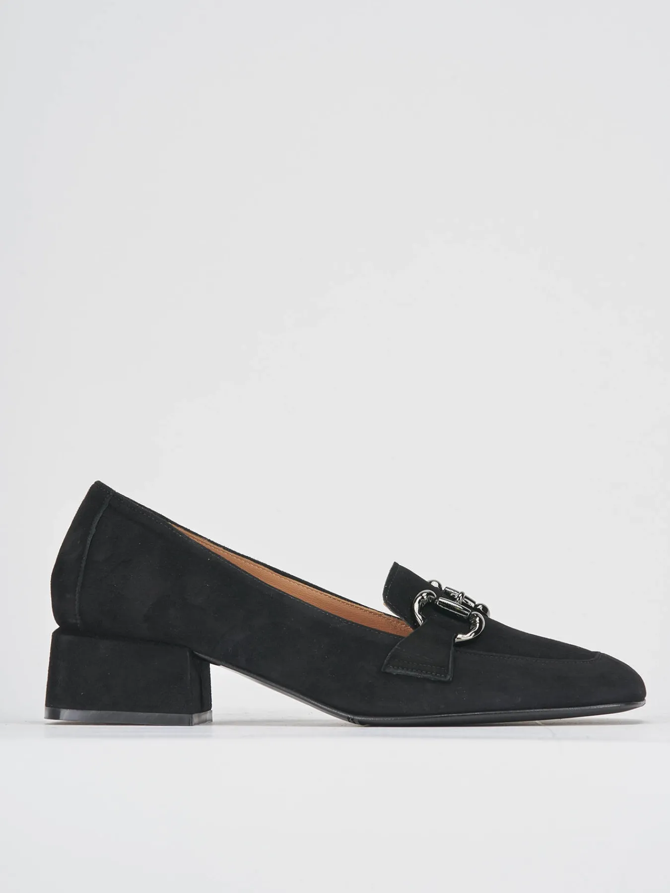 Mocassino tacco 3 cm fondo in leggerissima gomam e soletto interno in vera pelle. Tomaia in morbido camoscio, punta squadrata, cuciture visibili, morsetto in metallo e mascherina e tacco grosso per un look chic.
