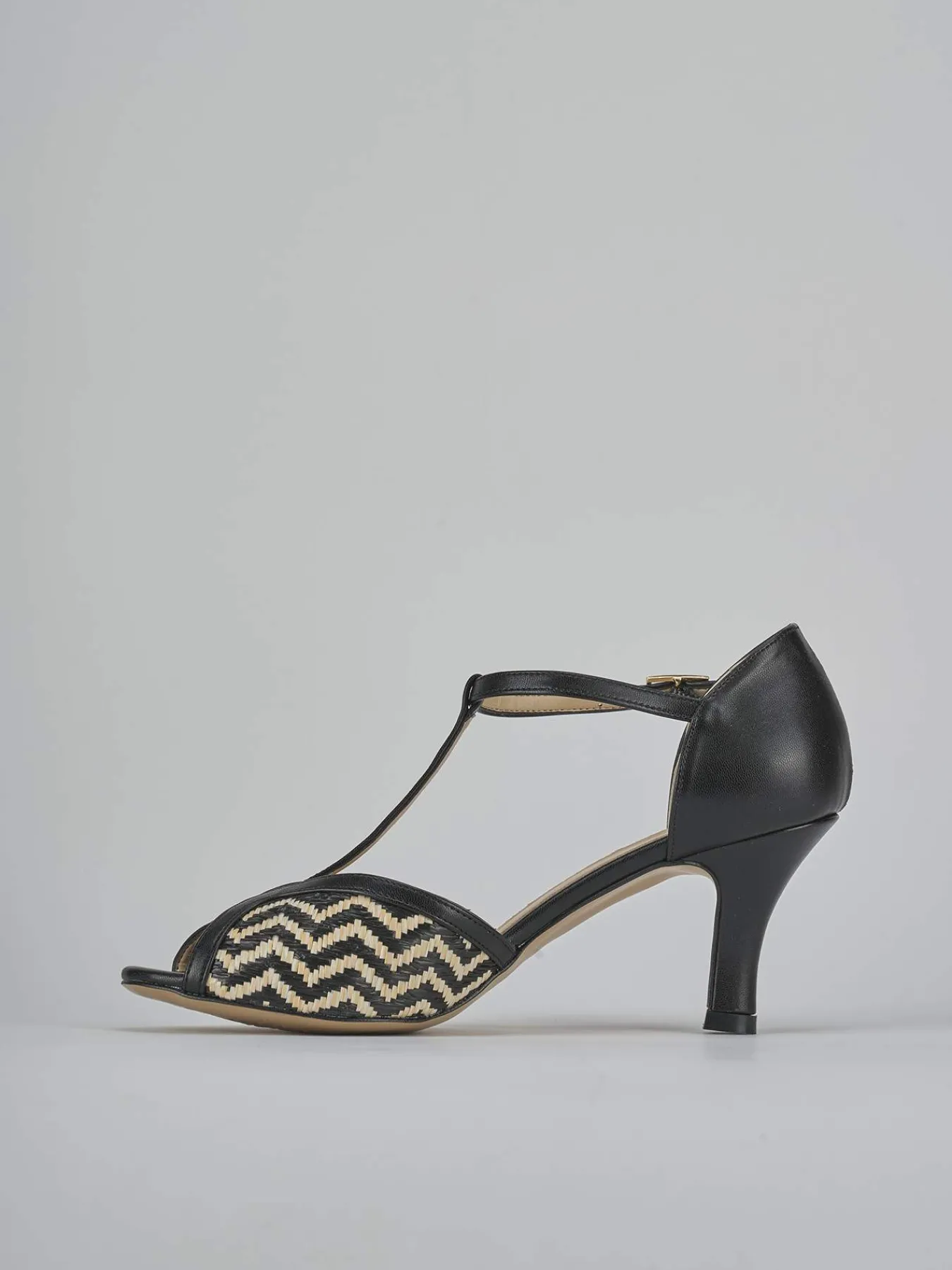 Sandalo tacco 7 cm fondo in leggerissima gomma e soletto interno in vera pelle. Tomaia in morbida pelle foderata con intrecciatura effetto rafia, punta affusolata, cinturino a ‘T’ con fibbia regolabile e tacco grosso. Perfetto con una gonna e una maglia.