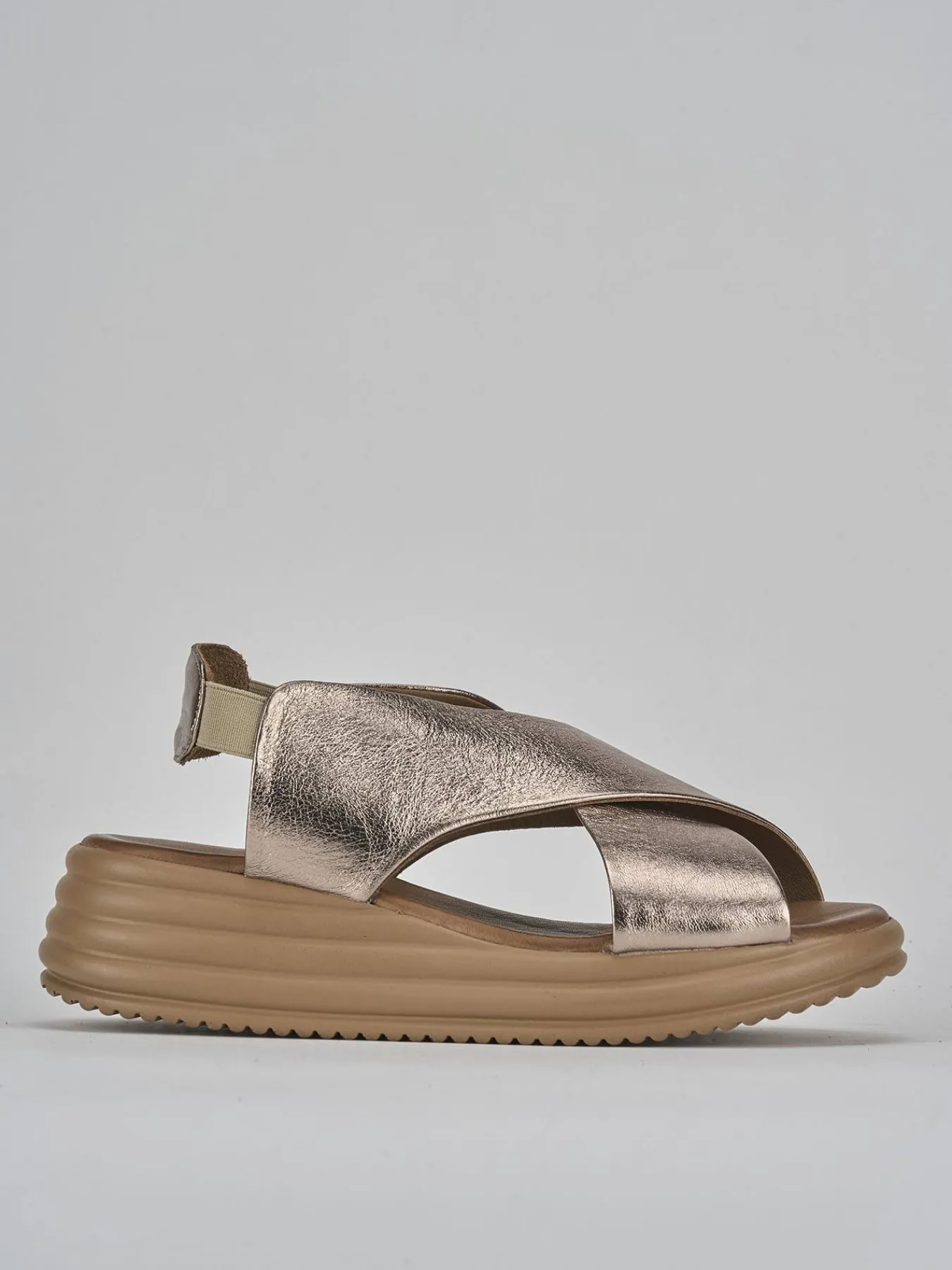 Sandalo zeppa 5 cm fondo in leggerissima gomma e soletto interno in vera pell. Tomaia in morbida pelle laminata, punta affusolata, fasce incrociate, cinturino elasticizzato e piccolo plateau anteriore di 1 cm. Dal design semplice che dura nel tempo.