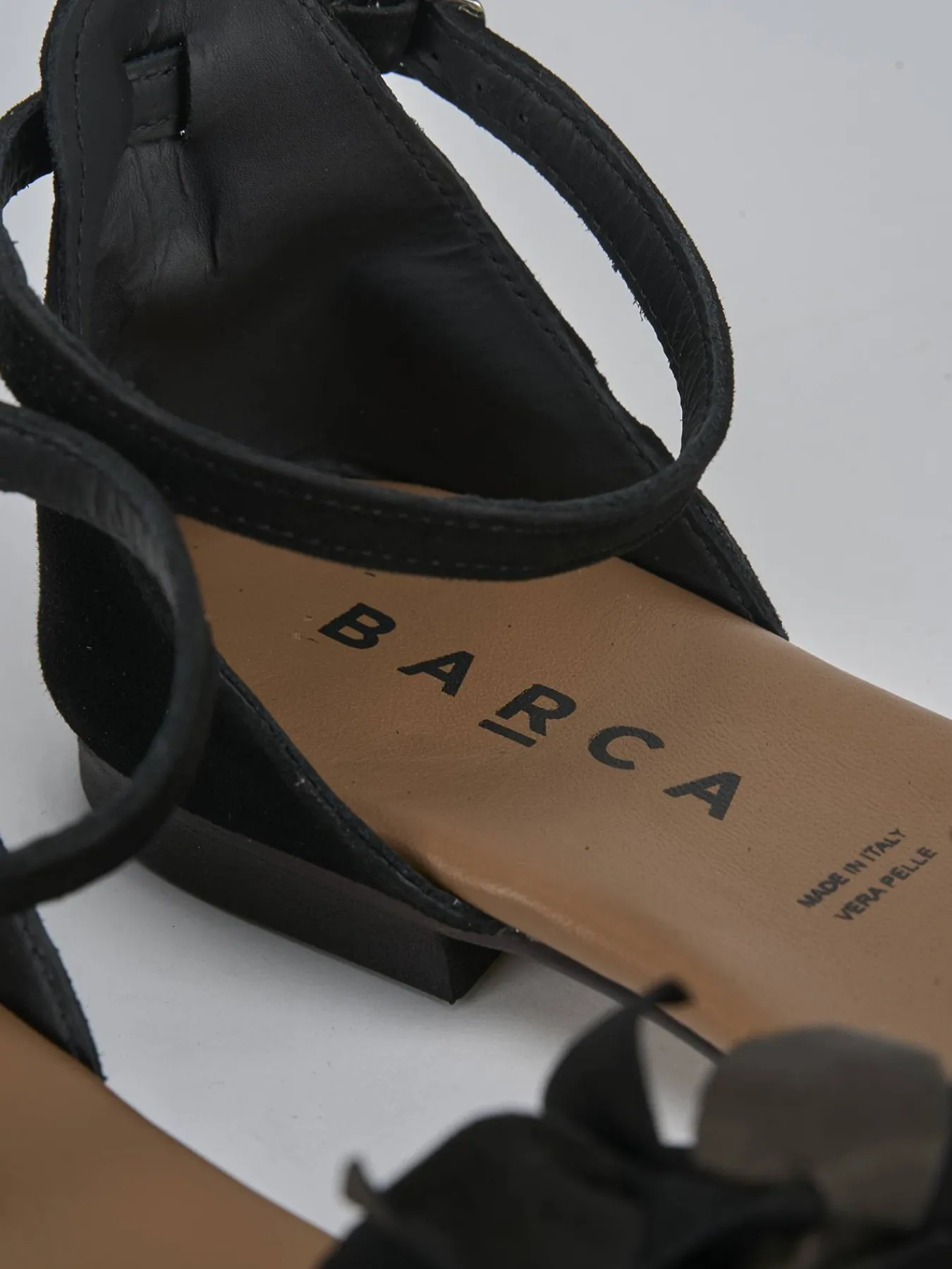 La tomaia è realizzata in morbido camoscio nero, con una punta affusolata e una fascia unica che valorizza il piede.