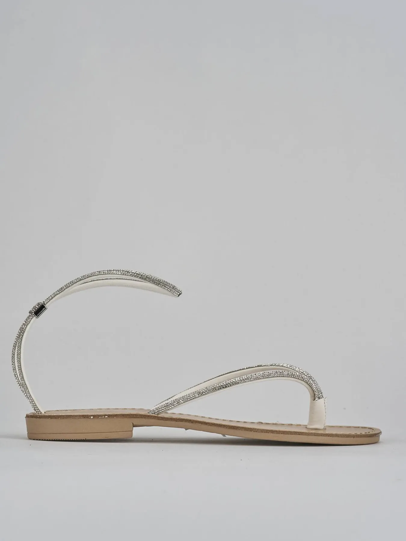 La punta affusolata e il design infradito aggiungono un tocco di modernità, mentre i sottili cinturini alla caviglia, arricchiti da strass trasparenti, donano un delicato tocco di eleganza.