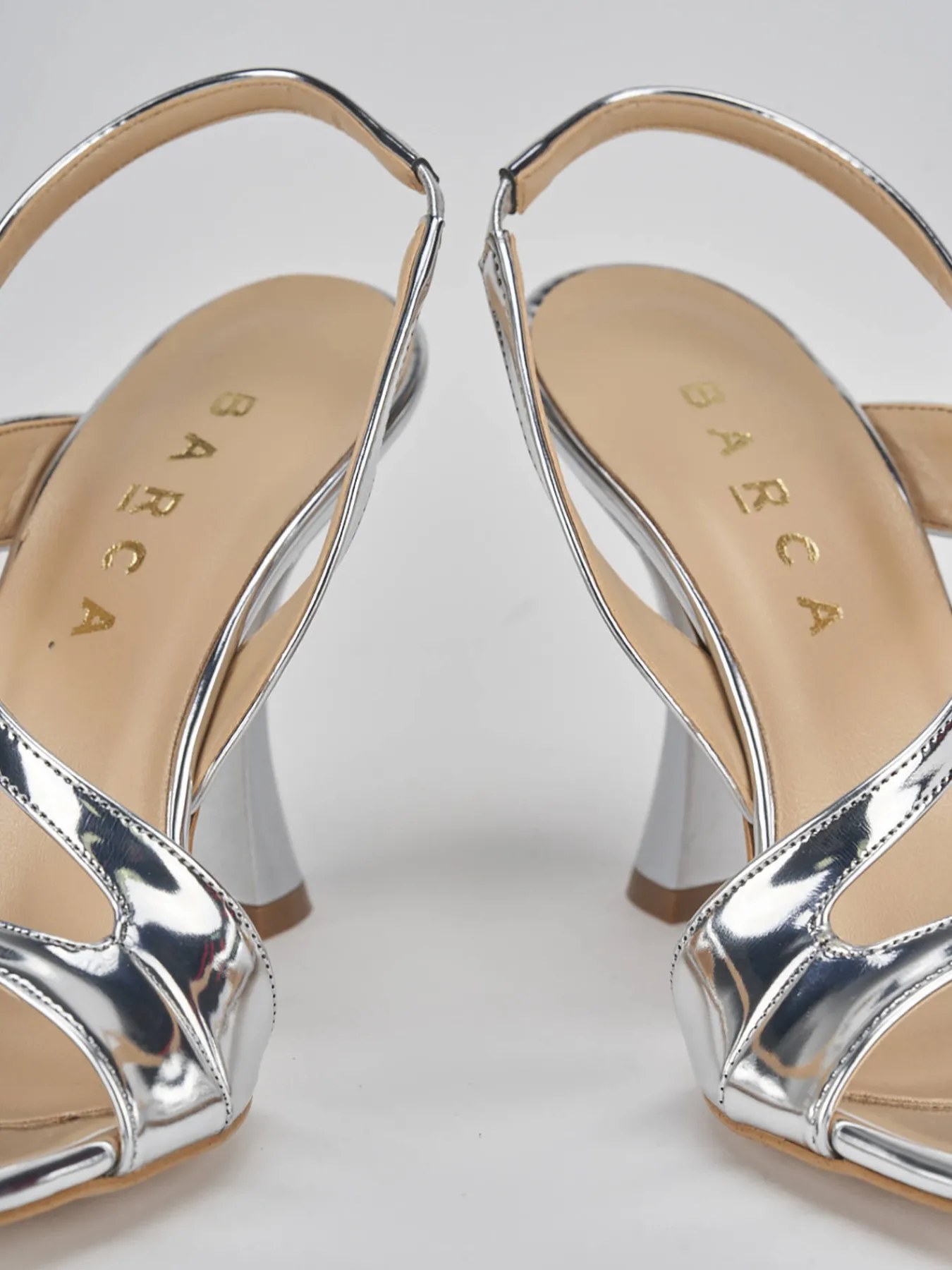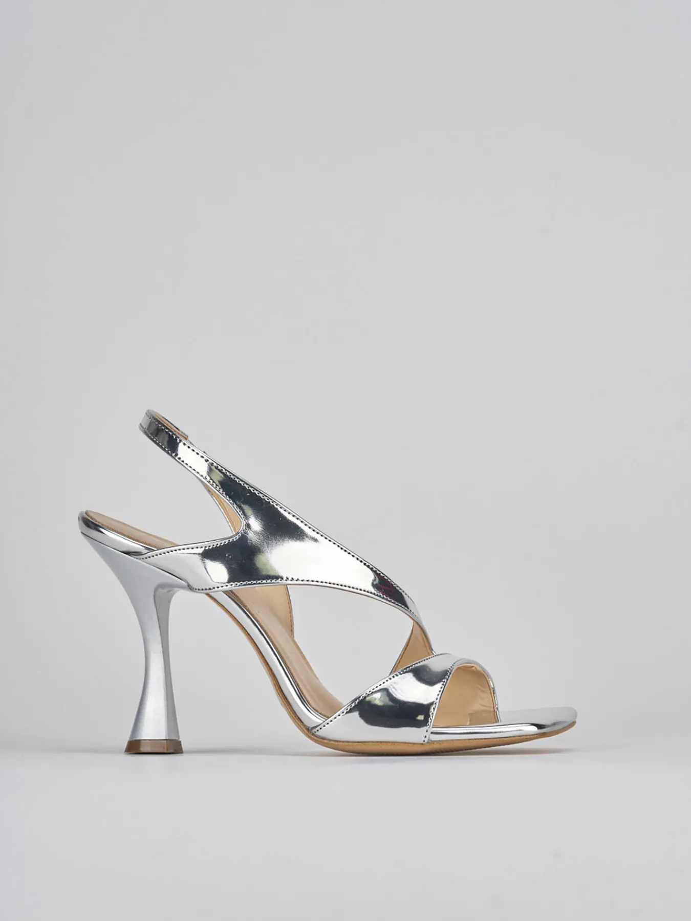 Sandalo tacco 9 cm, fondo in leggerissima gomma e soletto interno in vera pelle. Tomaia in morbida pelle effetto specchio, punta squadrata, fascia unica in punta, fibie e cinturino in caviglia regolabile, per un look glamour.