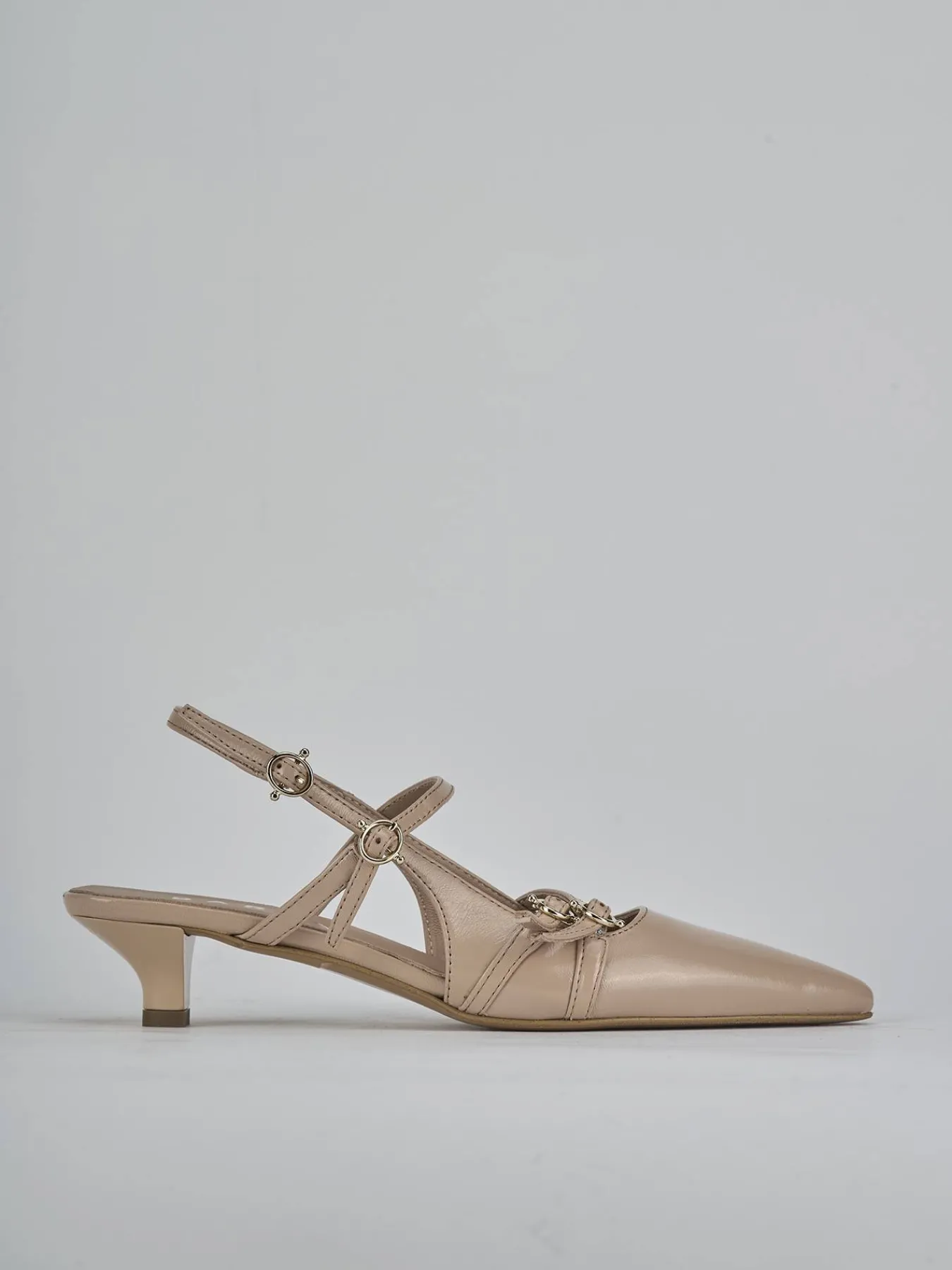 Slingback decolte’ tacco 3 cm fondo in leggerissima gomma e soletto interno in vera pelle. Tomaia in morbida pelle effetto verniciato, punta sfilata, collo squadrato, cinturini con fibbia regolabile incrociati sulla punta e cinturino in caviglia e nuovissimo tacco rocchetto per un look chic.