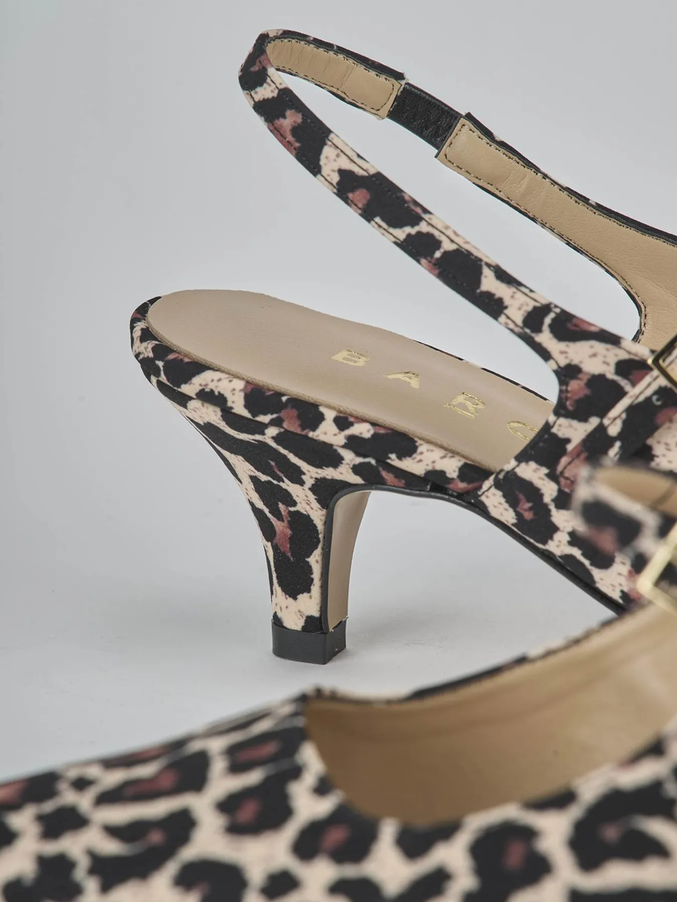 Slingback decolte’ tacco 4 cm fondo in leggerissima gomma e soletto interno in vera pelle. Tomaia in morbida pelle stampata leopardo, punta sfilata, scollo profondo squadrato, cinturino con fibbia regolabile sul collo del piede e cinturino elasticizzato sul tallone. Comodissimo tacco a cono per un look cool.