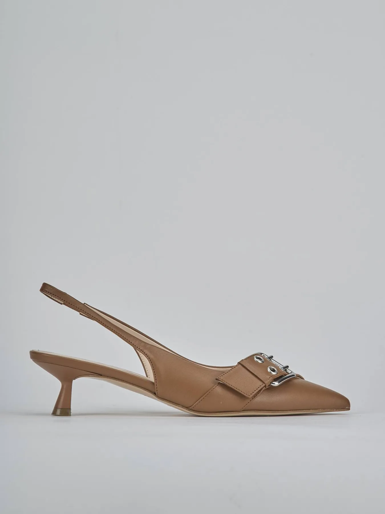 Slingback decolte’ tacco 4.5 cm fondo in leggerissima gomma e soletto interno in vera pelle. Tomaia in morbida pelle nappata, punta sfilata, scollo morbido a ‘U’, accessorio a fibbia con borchie forate, cinturino sottile con fibbia regolabile e tacco rocchetto per un look cool.