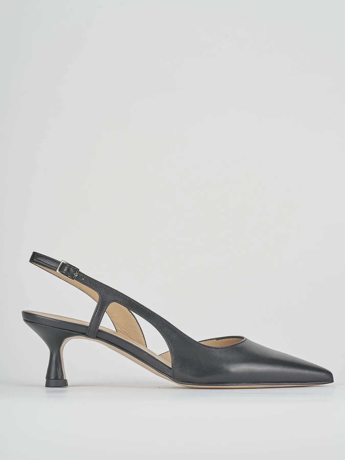 Slingback tacco 5 cm fondo in cuoio e soletto interno in vera pelle. tomaia in morbida pelle nappata, punta sfilata, apertura leggermente squadrata, fascia laterale unica e cinturino con fibbia regolabile. elegante e versatile per ogni tua occasione.