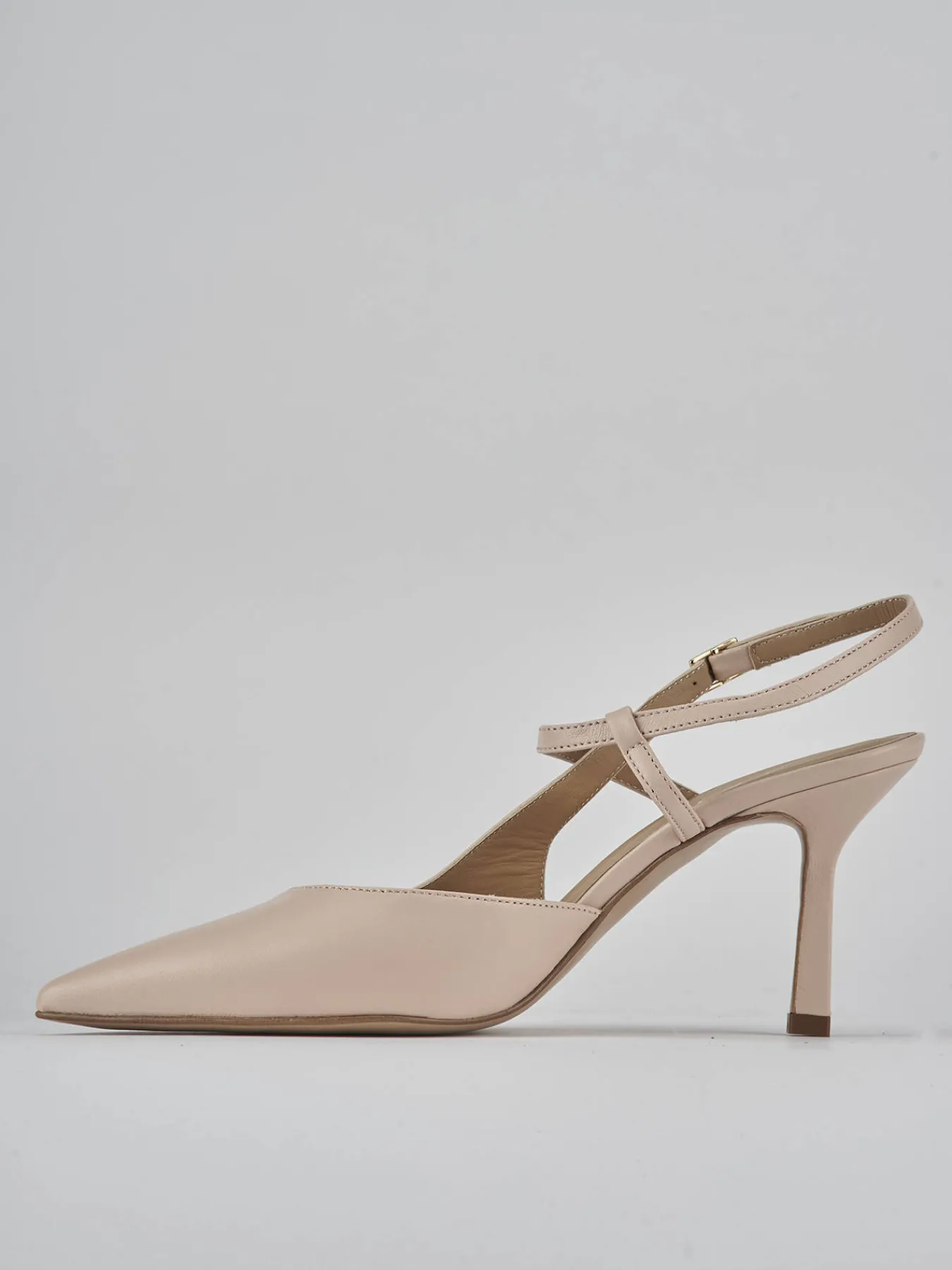 Slingback decolte’ tacco 7 cm fondo in cuoio e soletto interno in vera pelle. Tomaia in morbida pelle, punta sfilata, scollo a ‘U’, cinturino incrociato con fibbia regolabile e tacco fino. Perfetto per le tue serate più importanti.