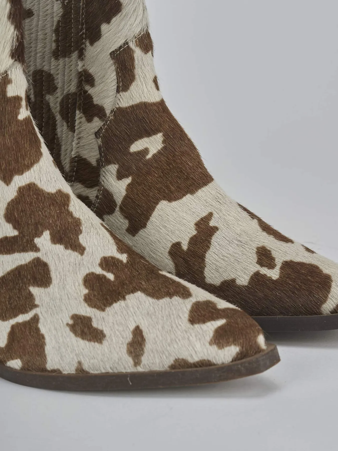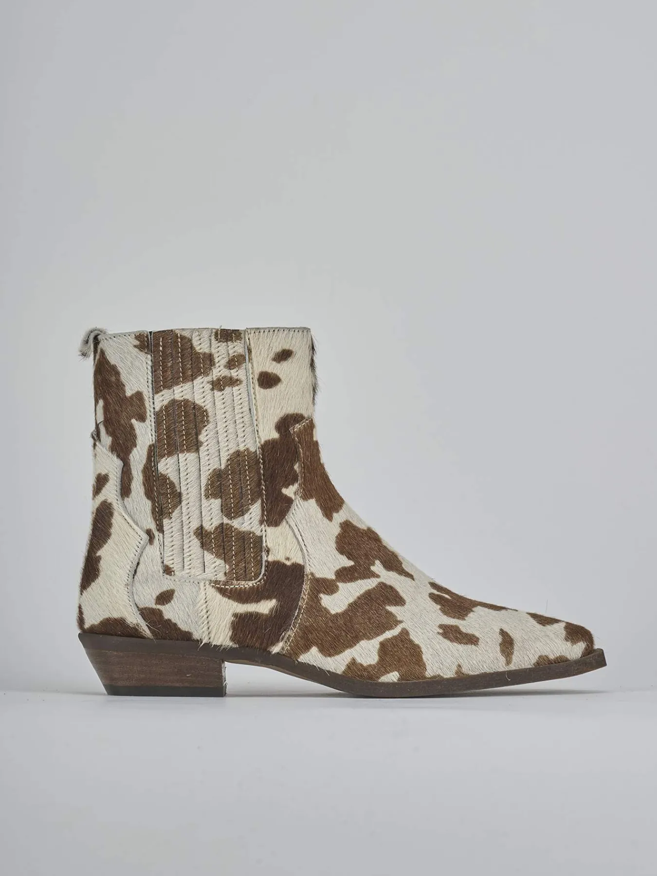 Stivaletto texano tacco 2 cm fondo in gomma e soletto interno in vera pelle. Tomaia in morbida pelle foderata in cavallino stampa effetto cow, punta sfilata, lati elasticizzati per il massimo del comfort.