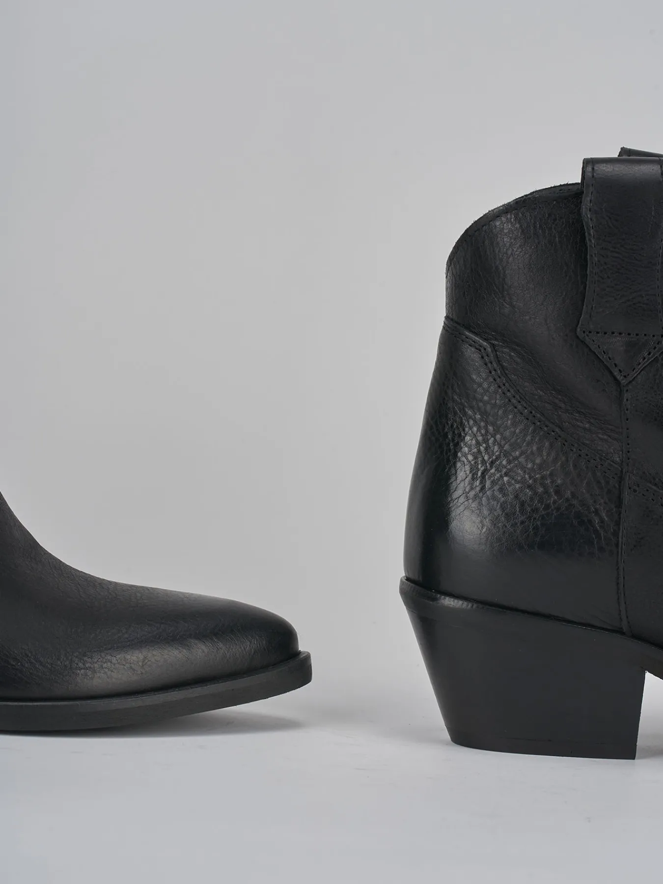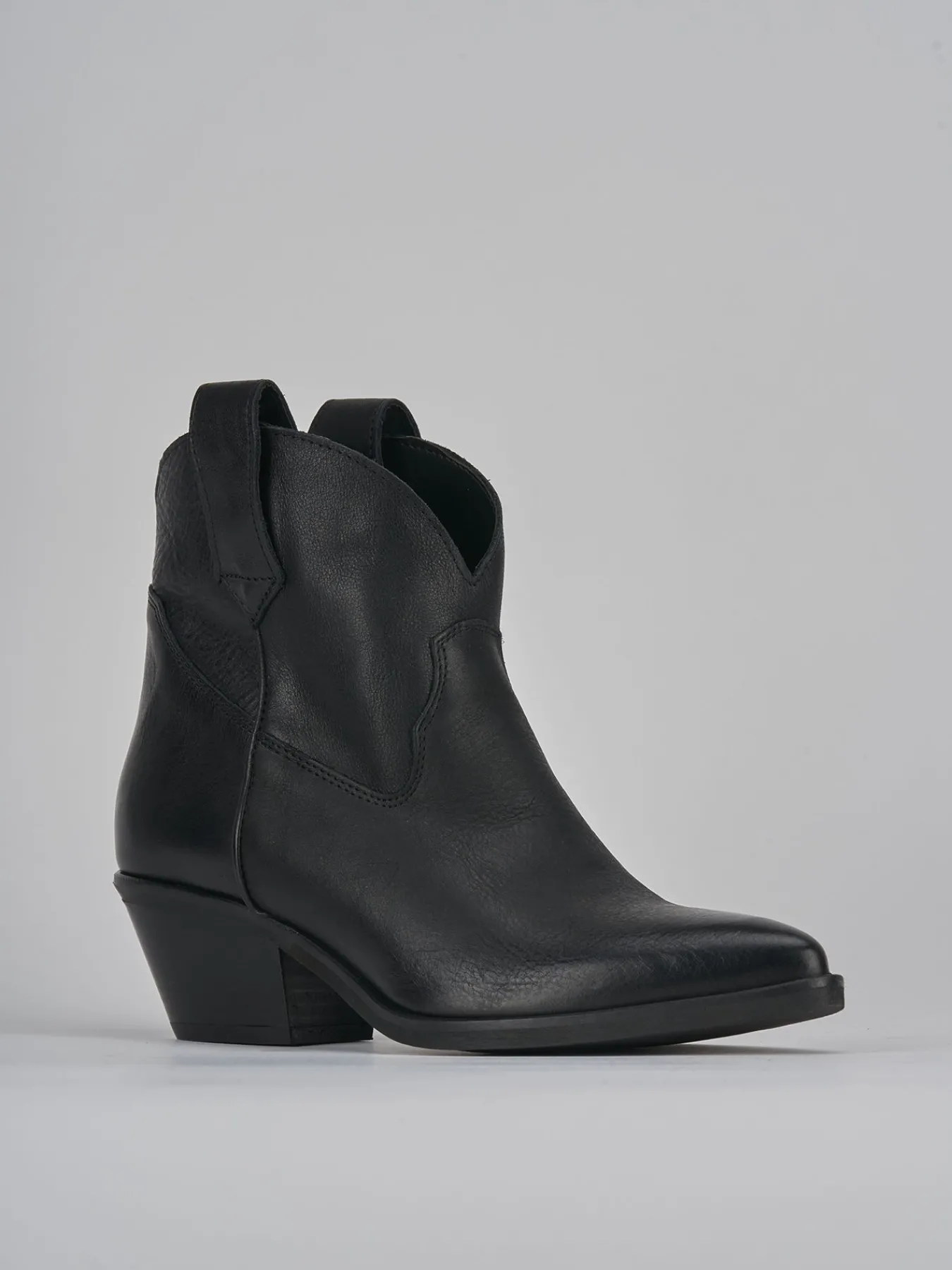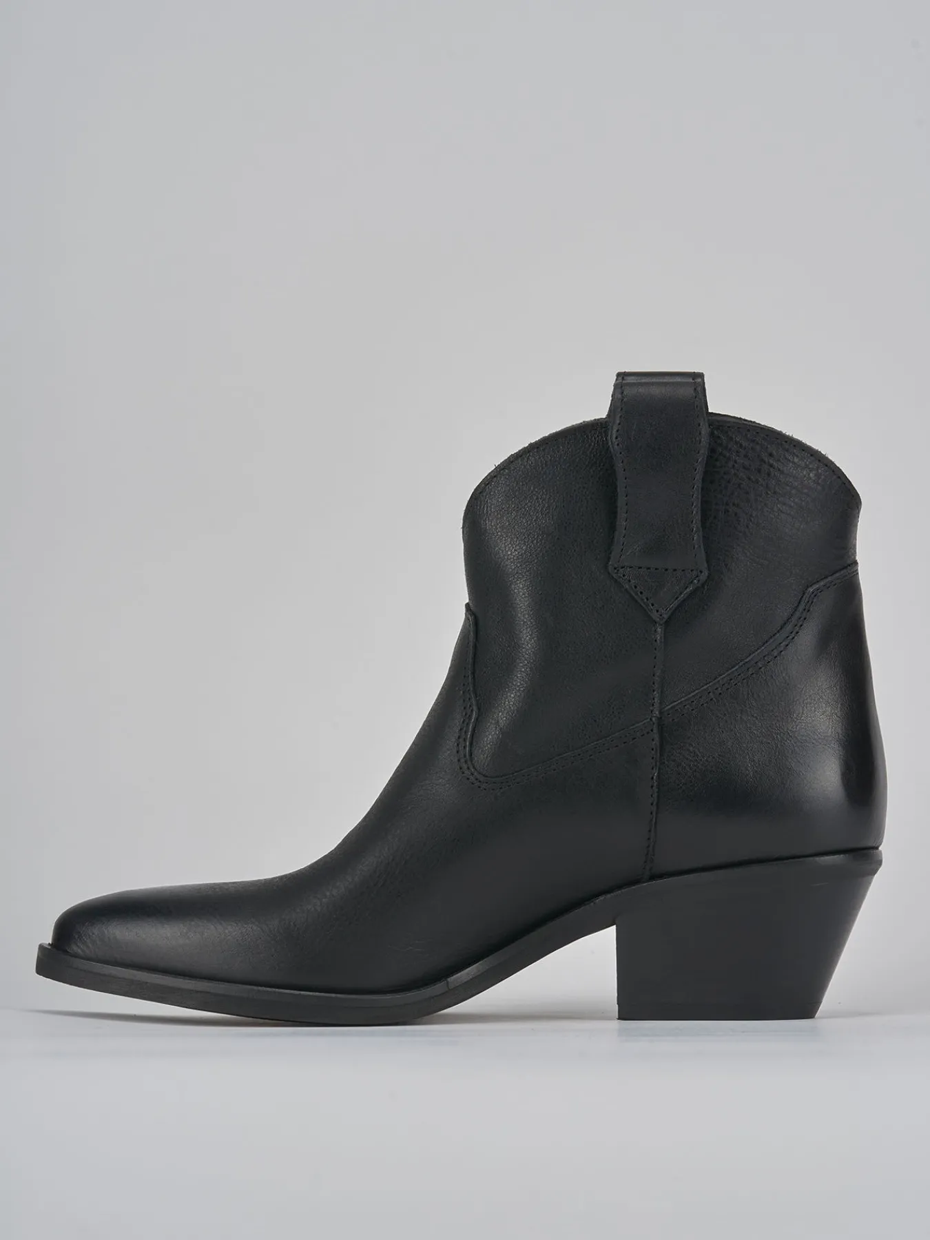Stivaletto texano tacco 4 cm fondo in gomma e soletto interno in vera pelle. Tomaia in morbida pelle, punta sfilata, cuciture visibili, apertura svasata, ghette, guardolo sporgente e tacco cubano in perfetto stile texano.