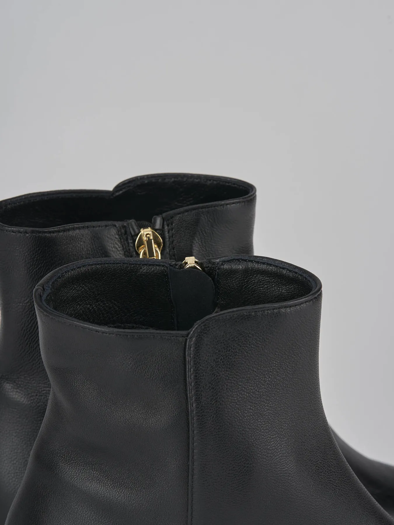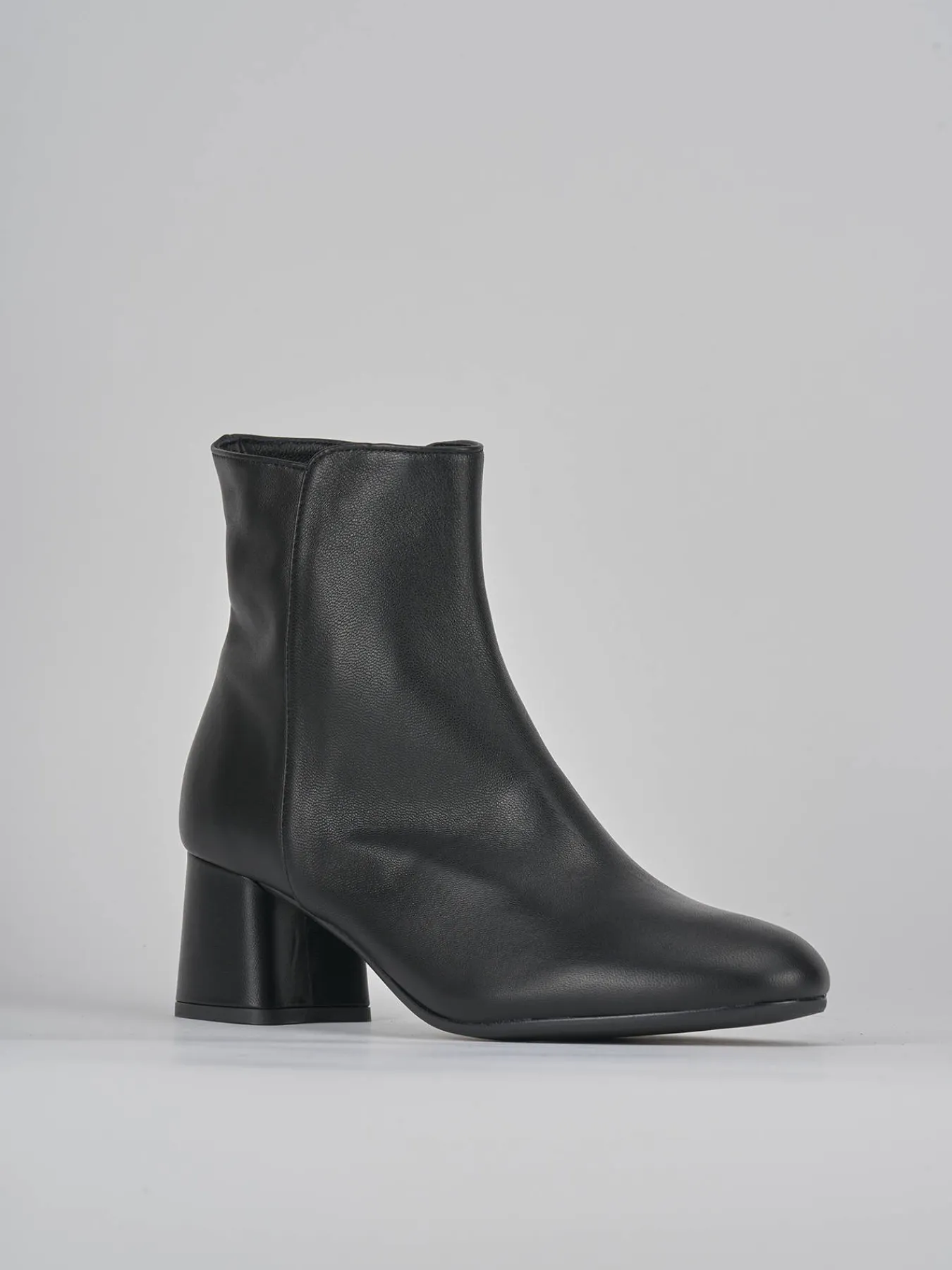 Stivaletto tacco 5.5 cm fondo in gomma e soletto interno in vera pelle. tomaia in morbida nappa, punta leggermente squadrata, cerniera laterale, cuciture visibili, tacco grosso. particolare svasato sui lati per un look cool.