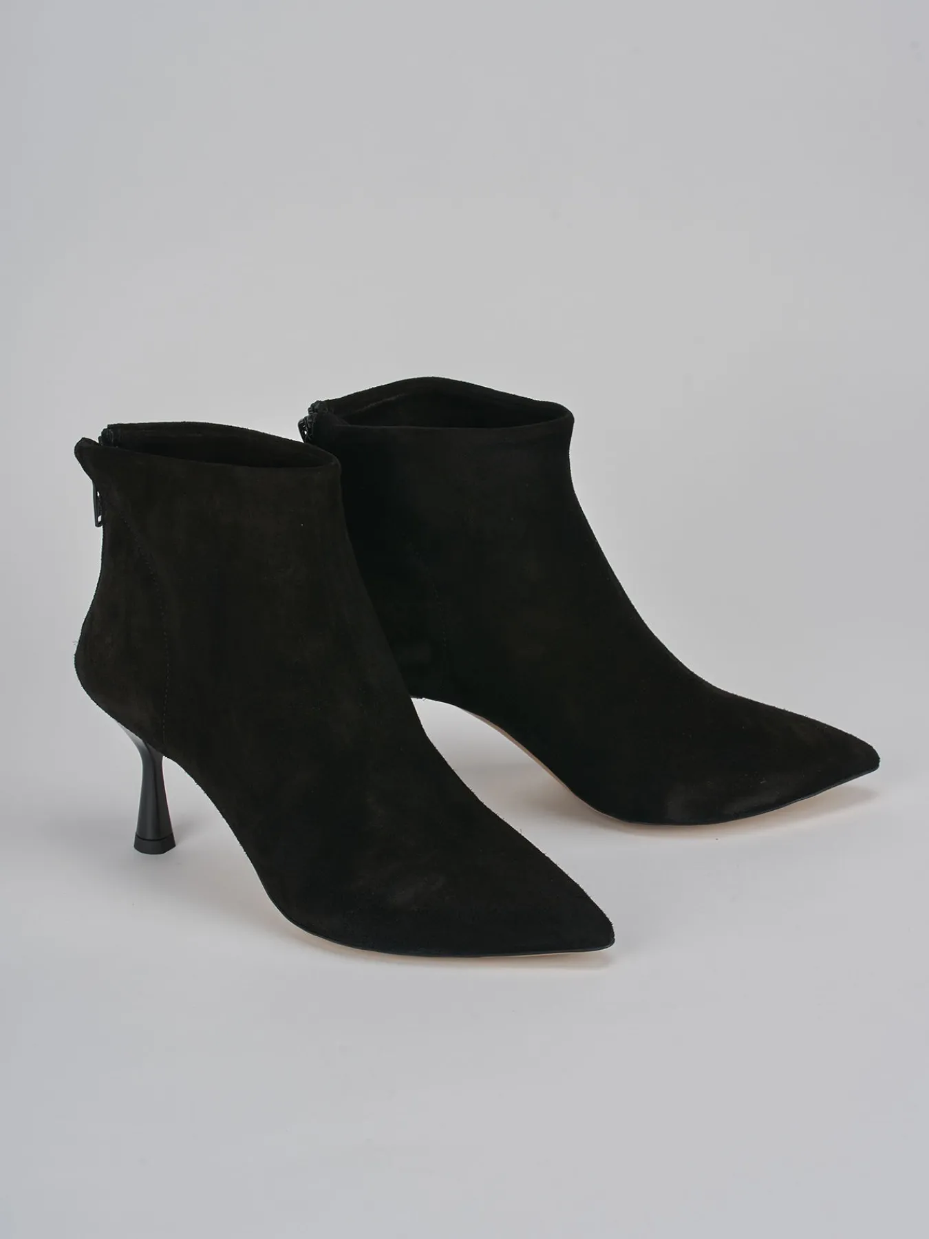 tronchetto tacco 7 cm fondo in gomma e soletto interno in vera pelle. tomaia in morbido camoscio, punta sfilata, cuciture a vista sul tallone, fondo liscio, comoda cerniera posteriore e tacco rocchetto in materiale abs. versatile con ogni tuo look.