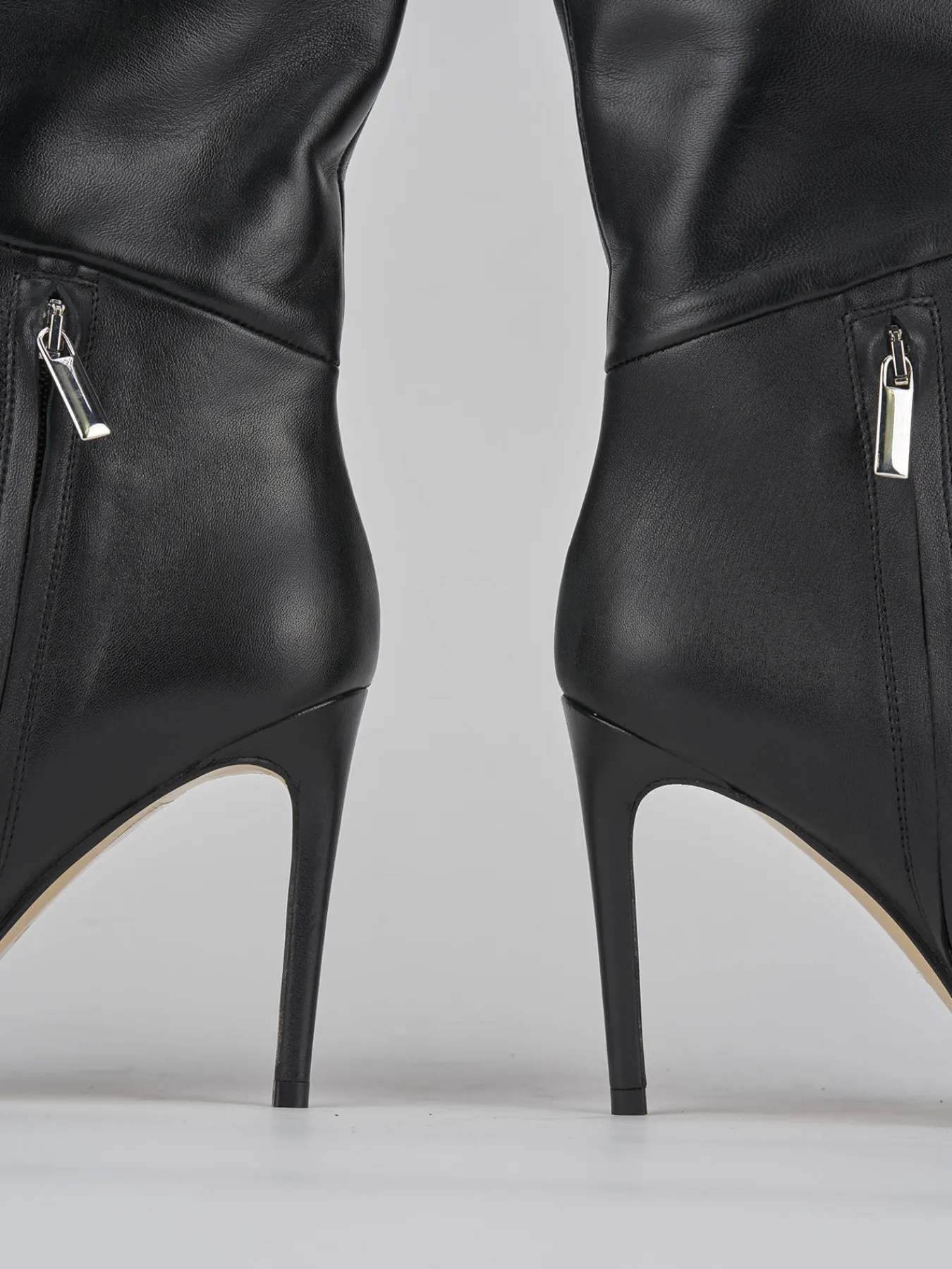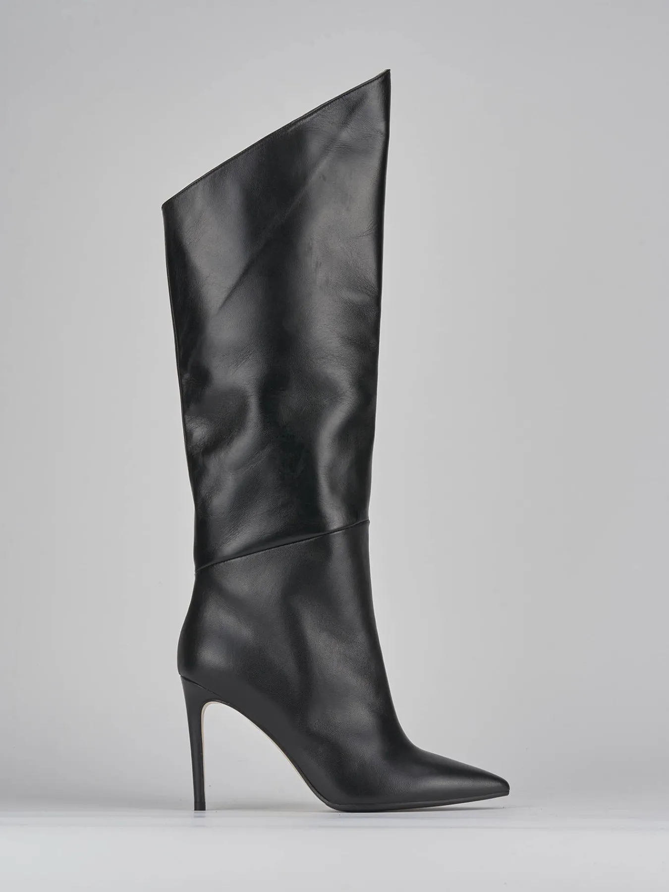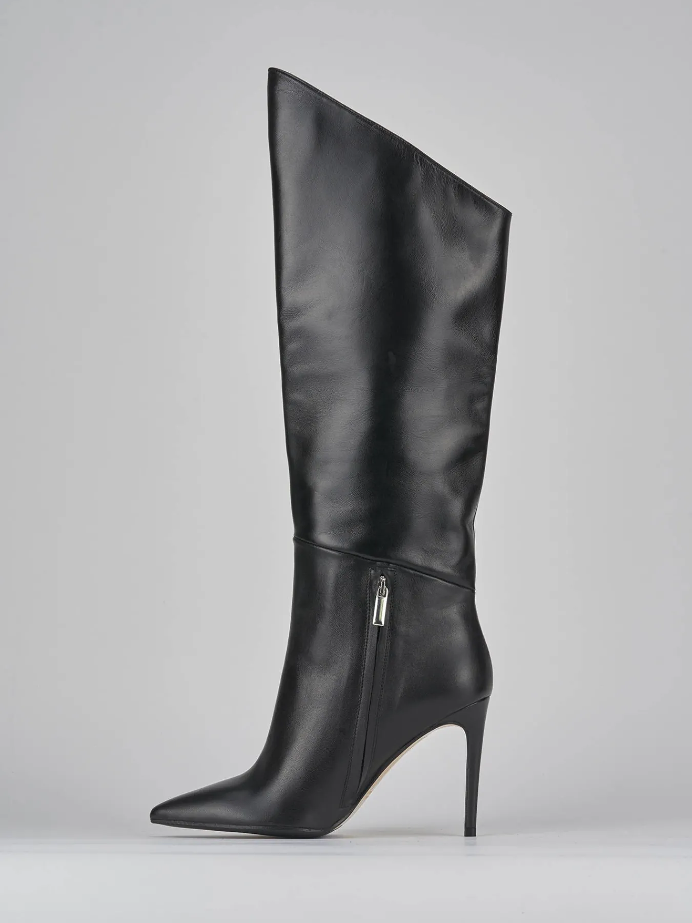 Stivale tacco 11 cm fondo in cuoio e soletto interno in vera pelle. Tomaia in morbida pelle, punta sfilata, comoda cerniera laterale, gambale con taglio obliquo cje misura appena sotto il ginocchio e tacco a spillo per un look che non passa mai di moda.