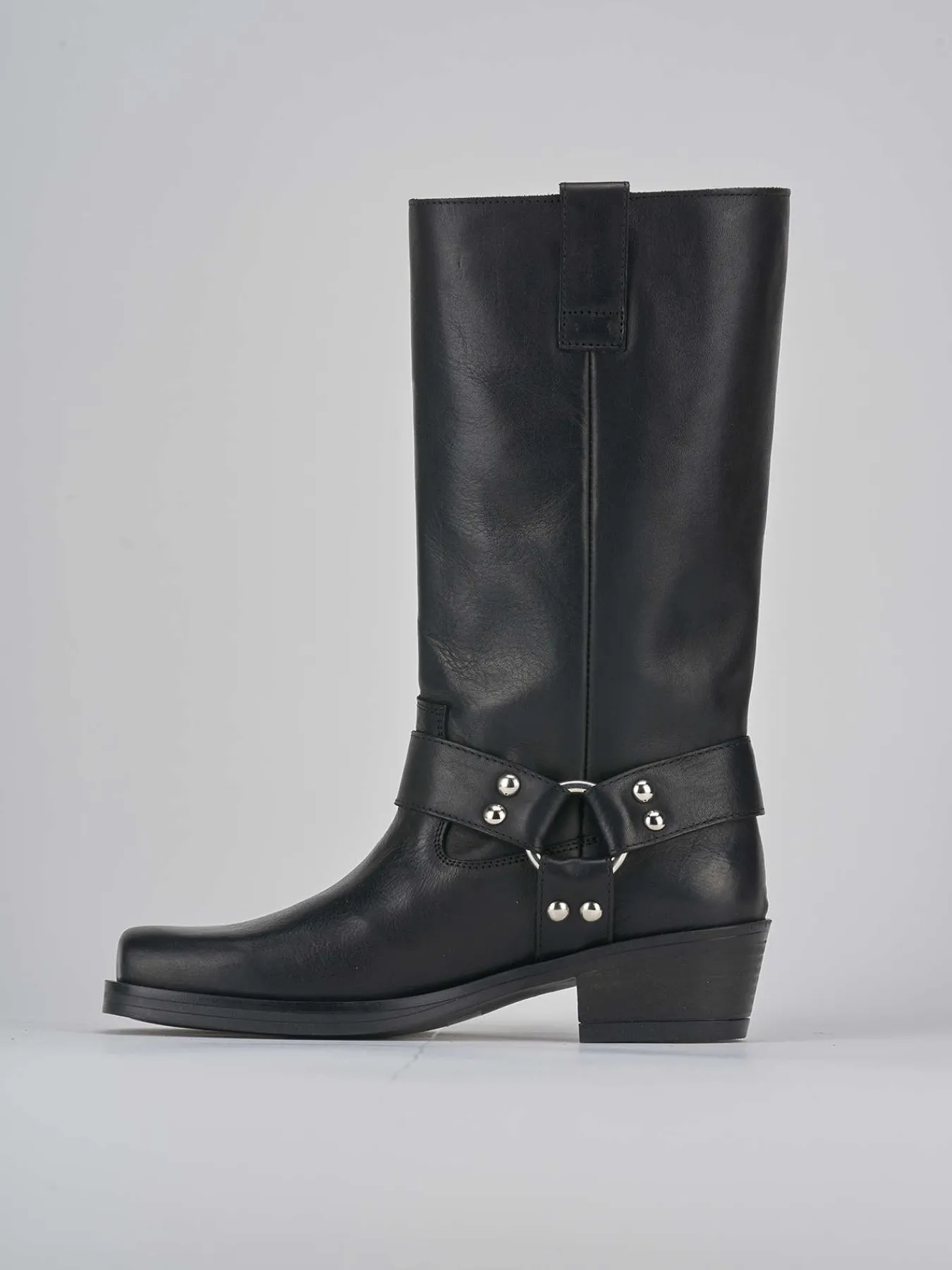Le fascette con accessorio all’altezza della caviglia e le cuciture visibili esaltano il design biker.