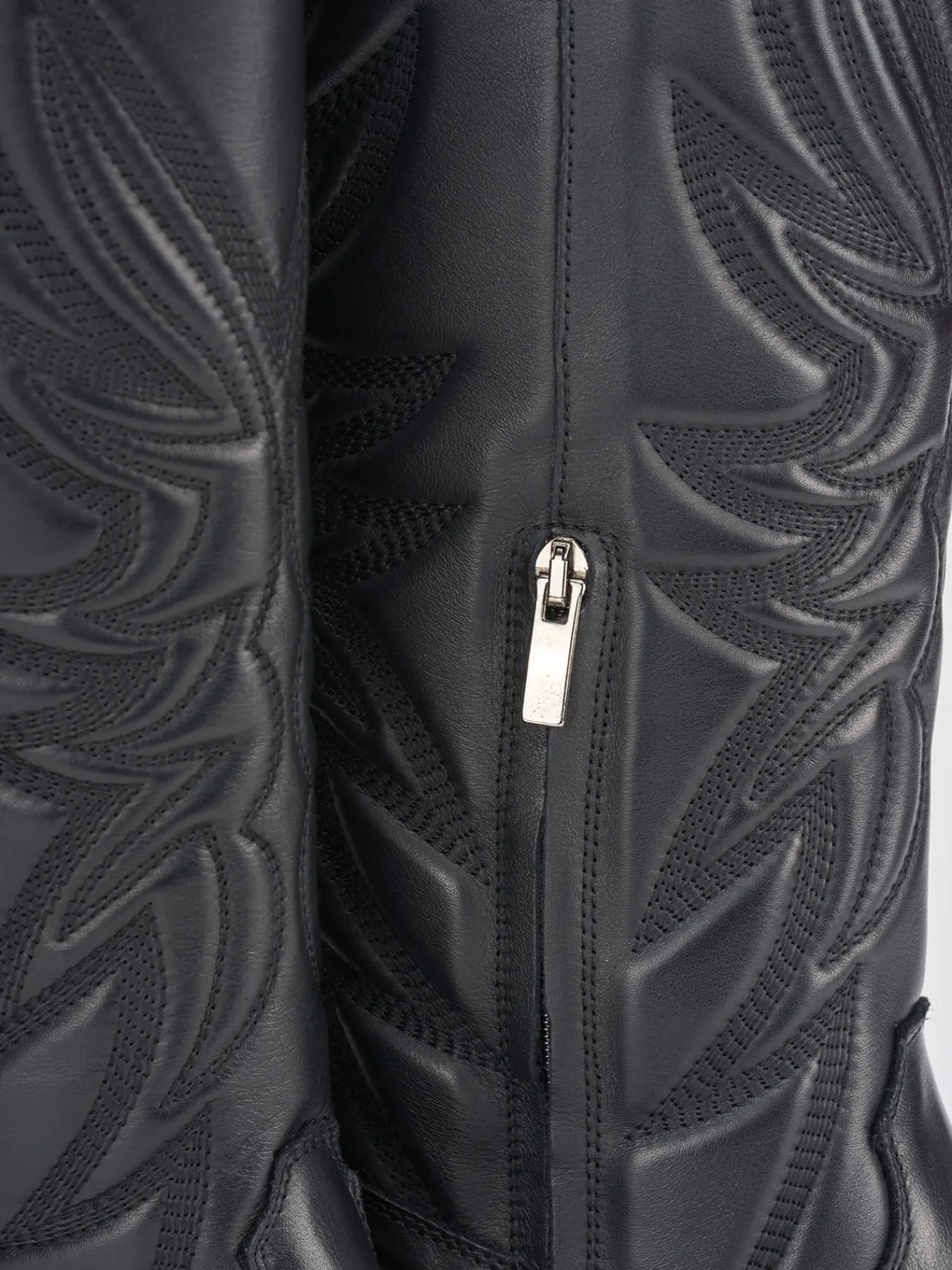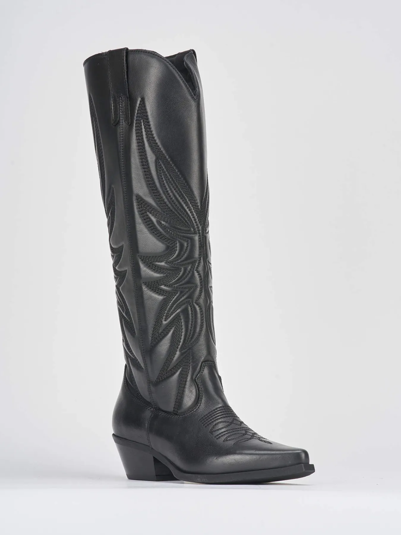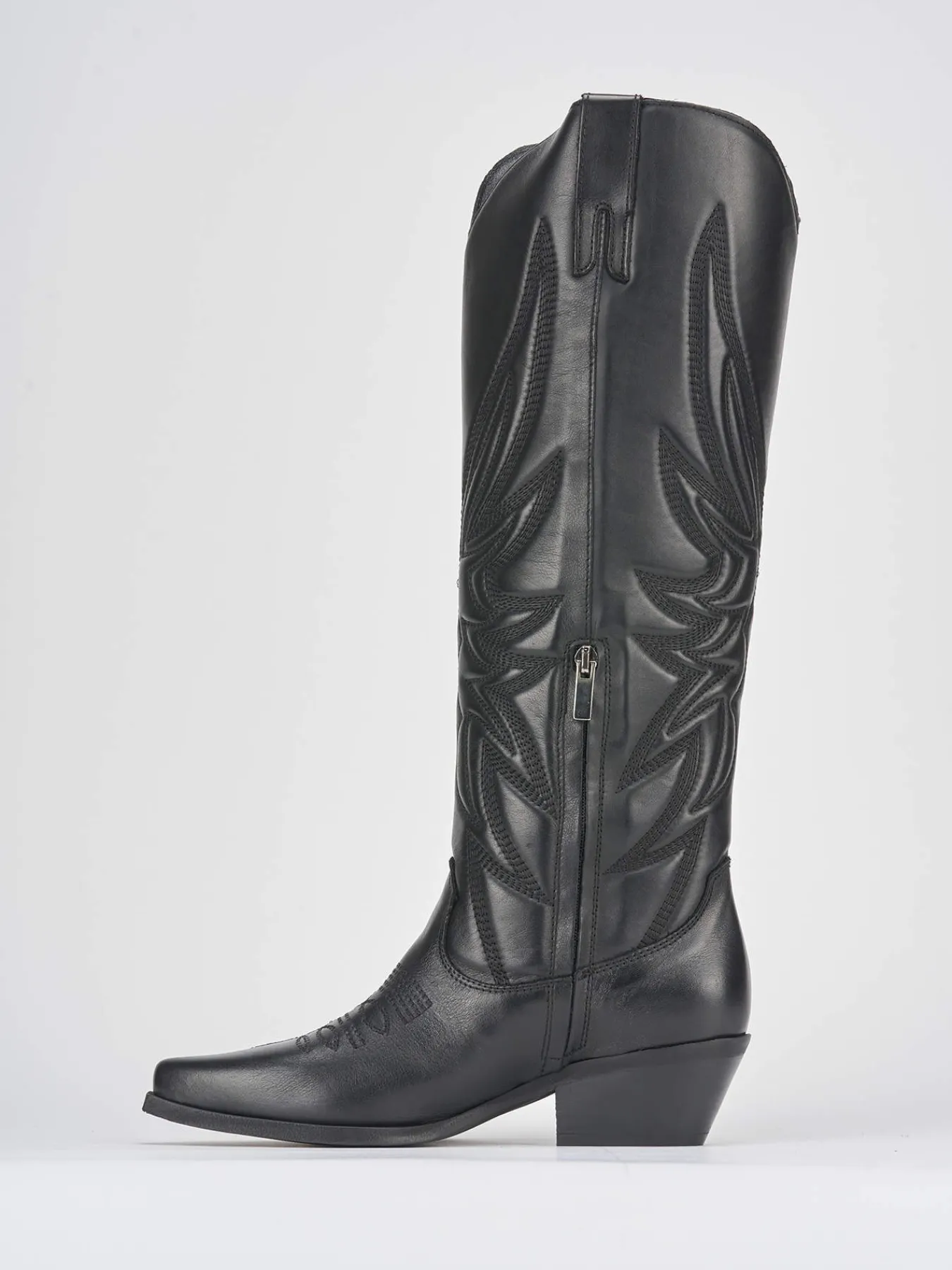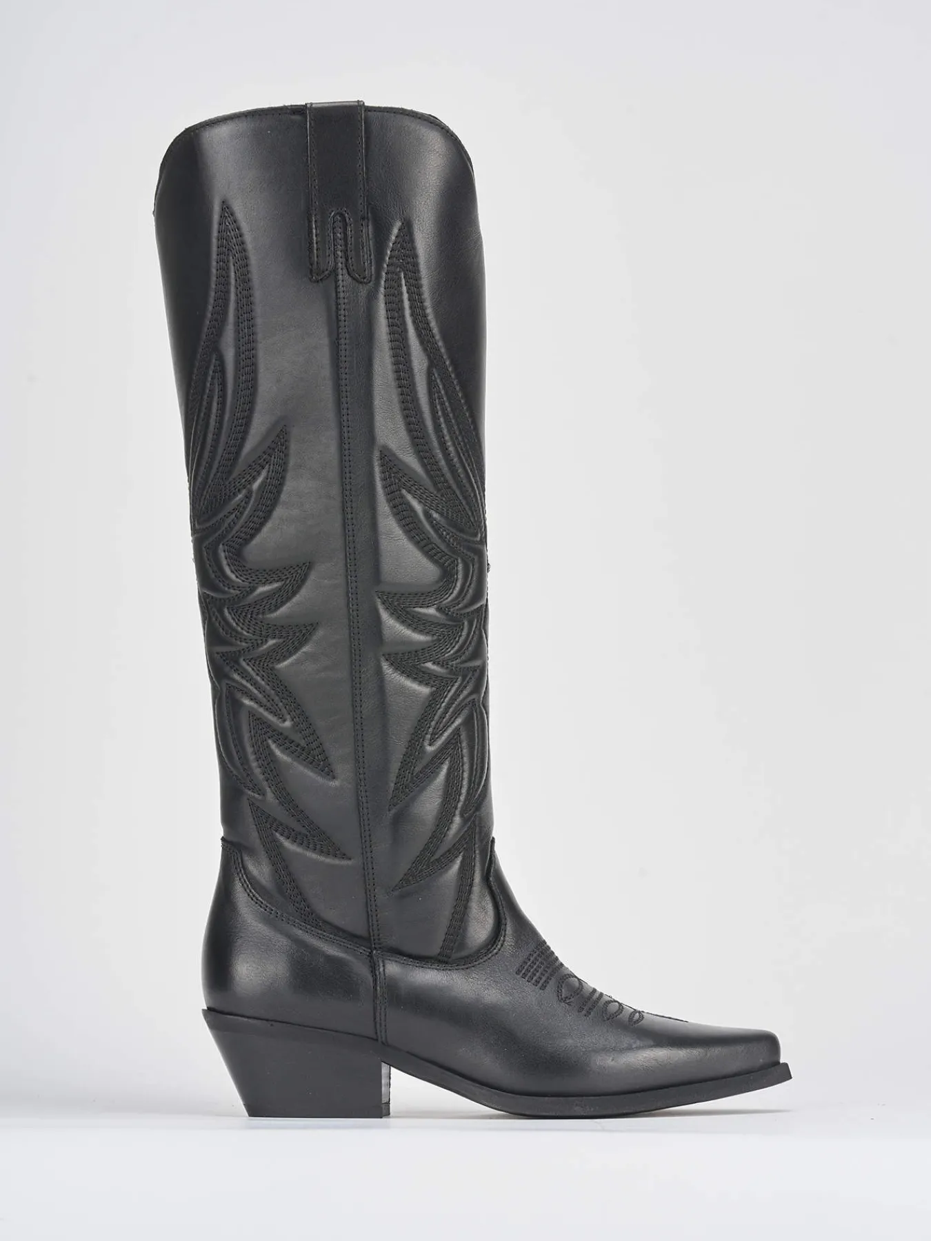 Stivale tacco 5 cm fondo in gomma e soletto interno in vera pelle. Tomaia in morbida pelle, punta sfilata, raffinati ricami sul collo del piede e sul gambale, stile texano, ghette e comoda cerniera laterale. adatto con una minigonna e un maglione over.
