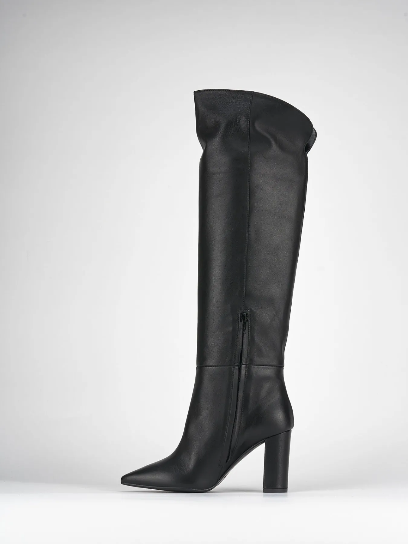 stivale tacco 8.5 cm fondo in gomma e soletto interno in vera pelle. tomaia in morbida pelle nappata, punta sfilata, gambale tubolare con accessorio che arriva appena sopra il ginocchio e tacco comodo per un look cool.