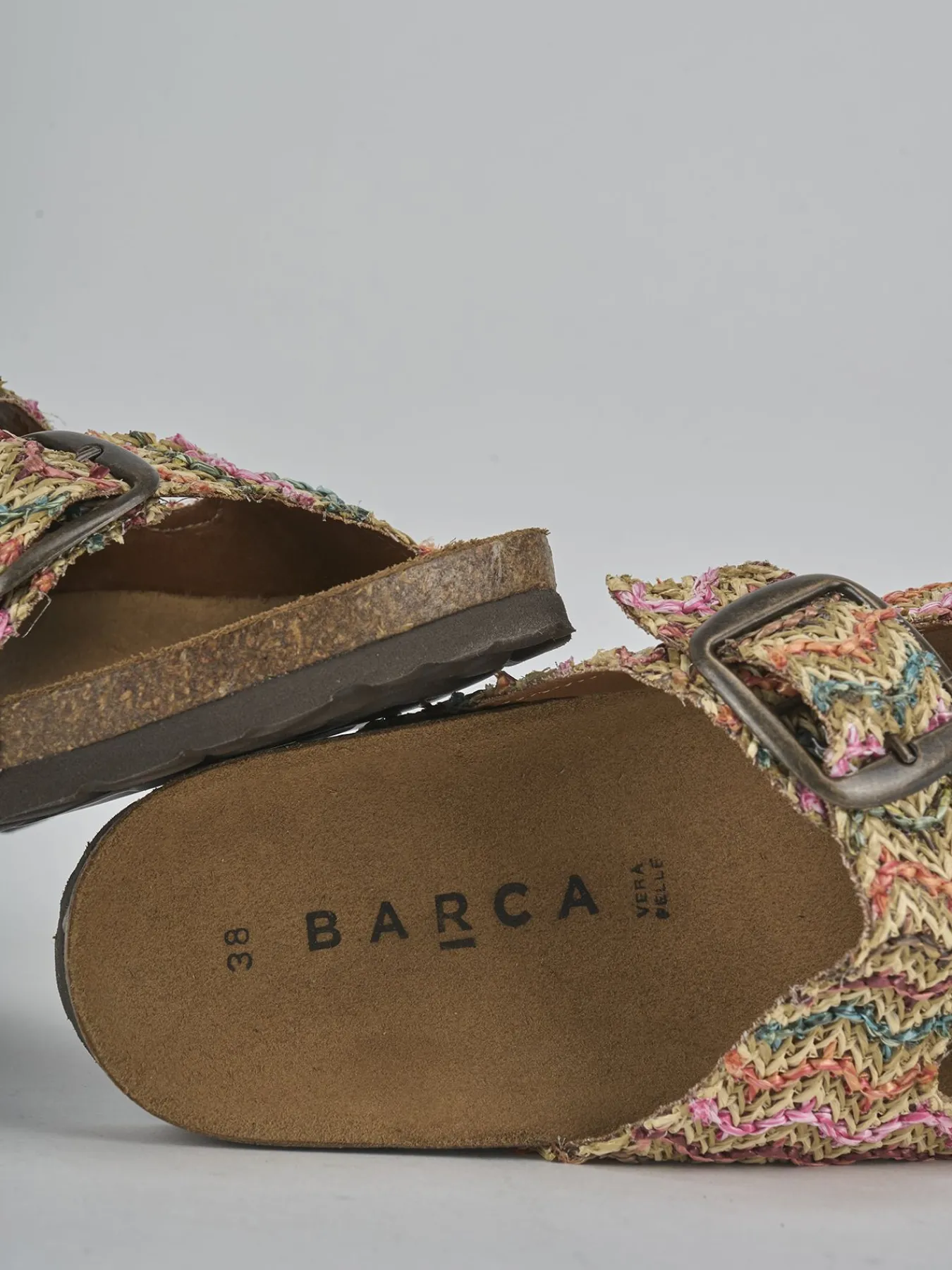 Realizzata in tessuto di rafia multicolor, questa ciabatta presenta una tomaia in morbido camoscio foderato, ideale per chi cerca stile e comodità.