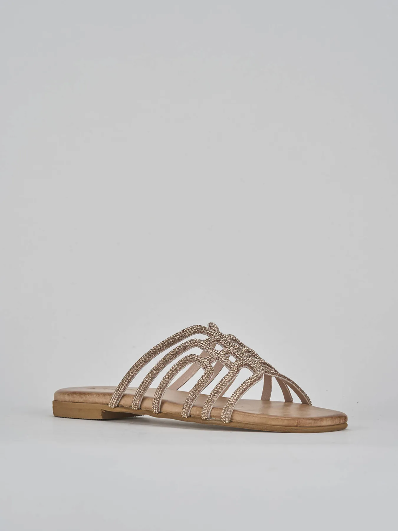 La tomaia è realizzata in morbida pelle, arricchita da minifascette intrecciate con applicazioni di strass che donano un tocco di brillantezza.