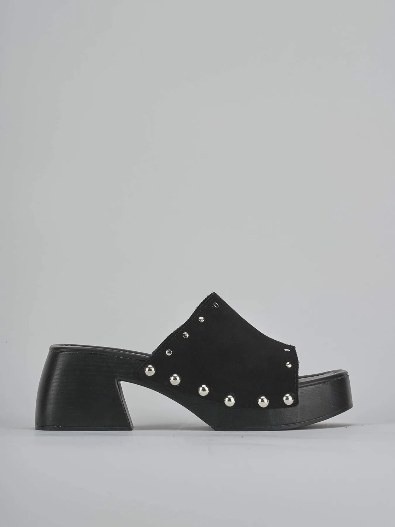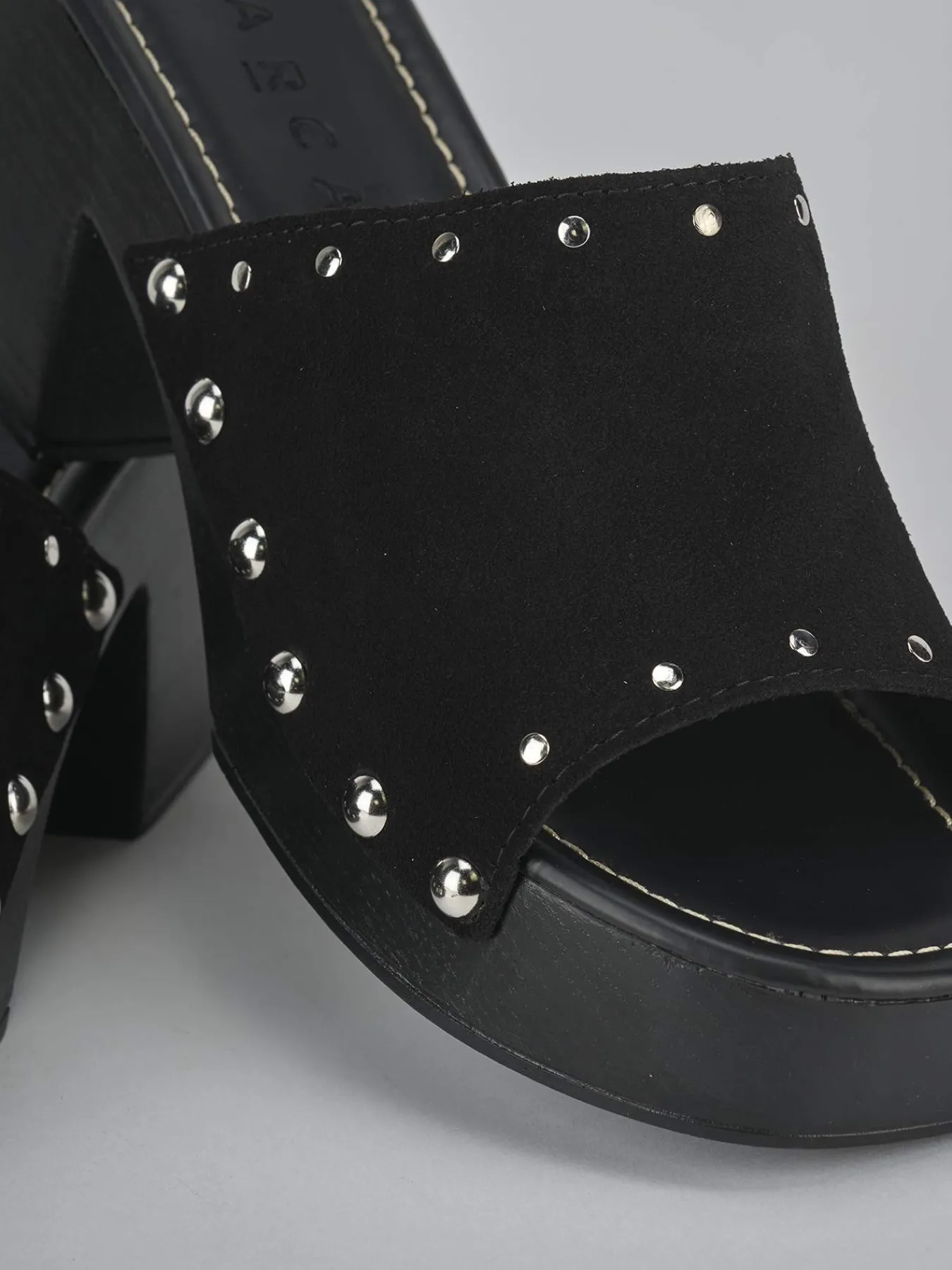 Ciabatta tacco 6 cm fondo in gomma e soletto interno in vera pelle. Tomaia in morbido camoscio, punta leggermente squadrata, fascia unica, borchie e tacoc stabile. Plateau amteriore di 1.5 cm a per un look cool.