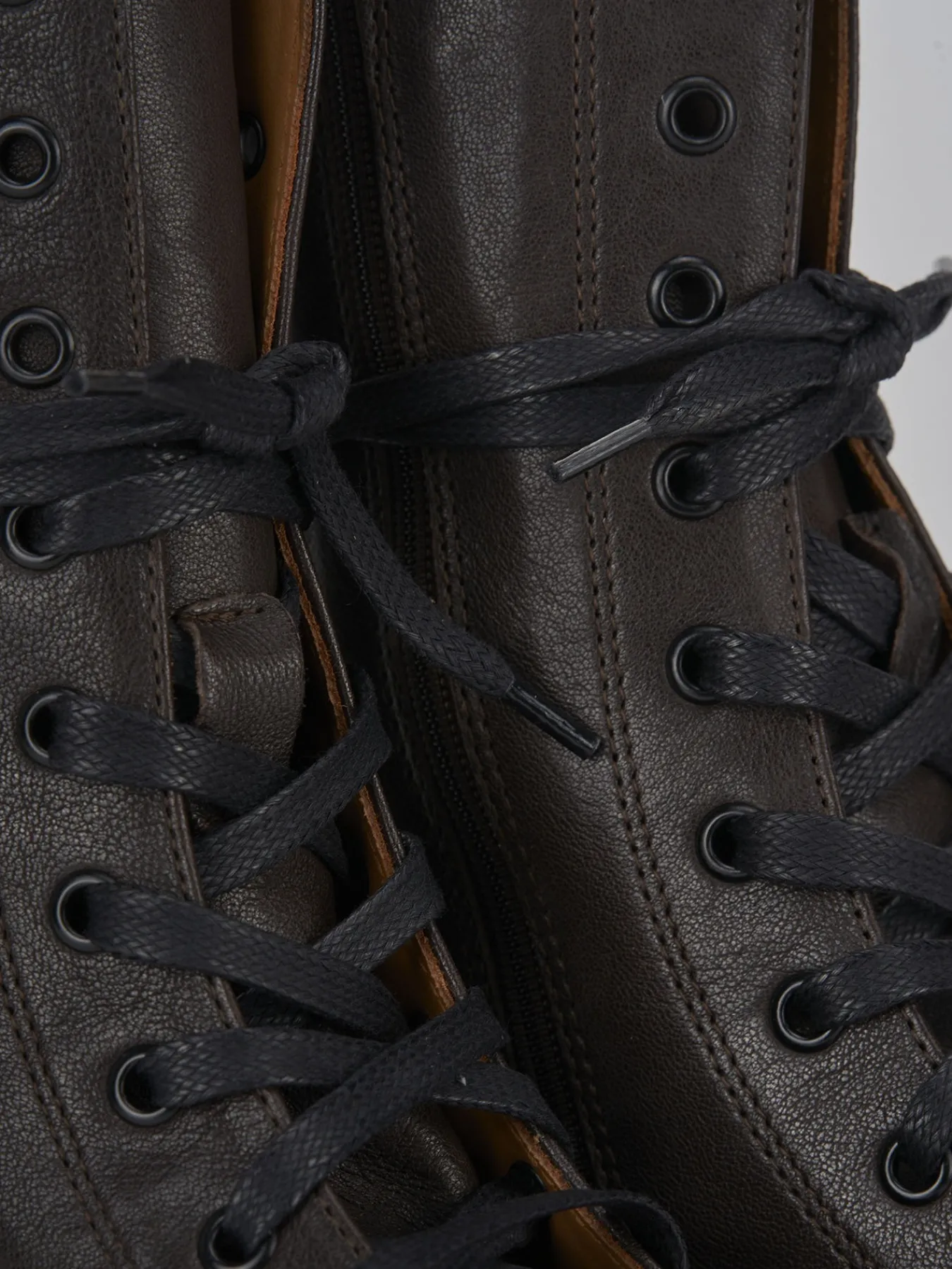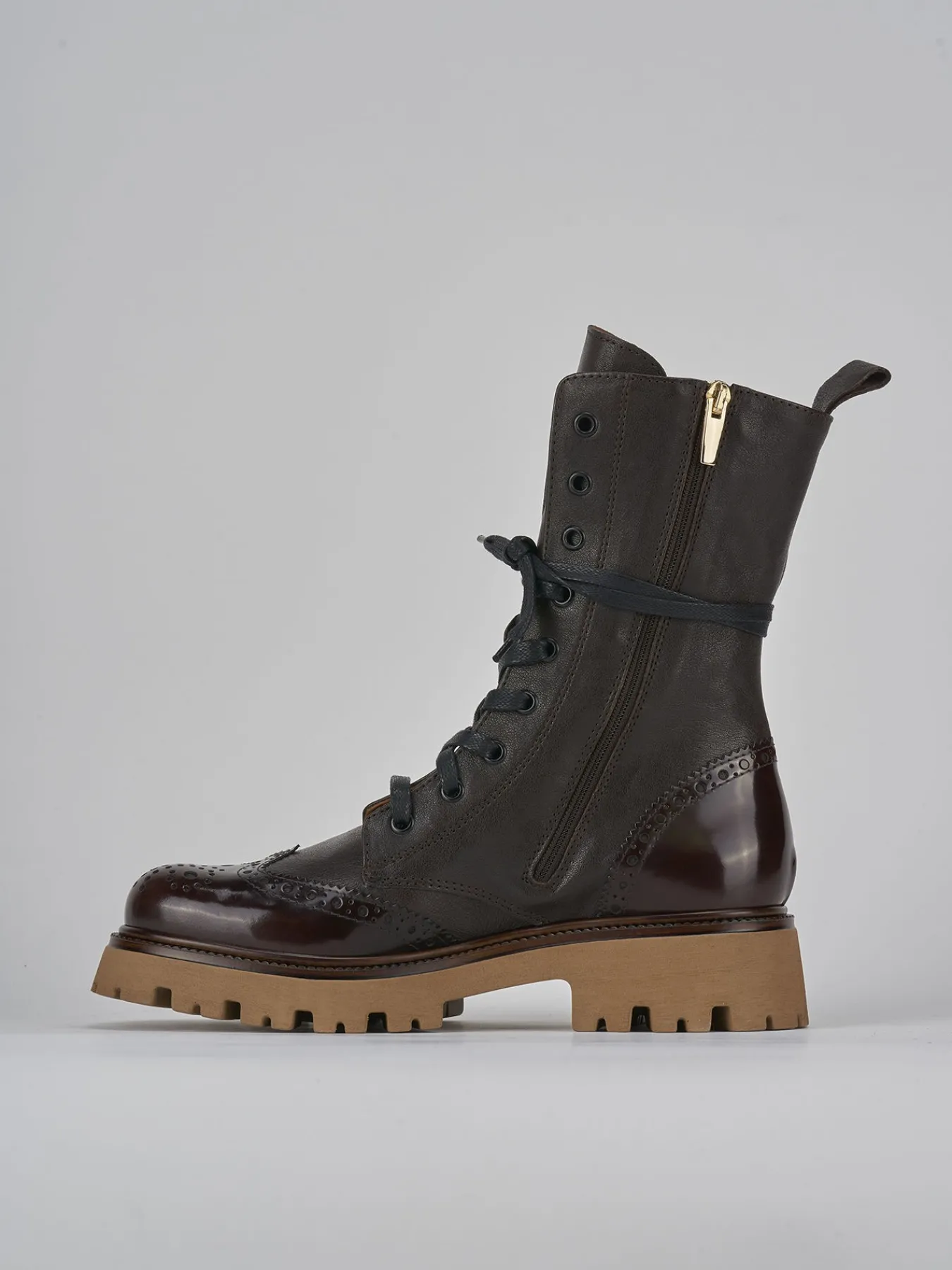 Anfibio tacco 2 cm fondo in gomma e soletto interno in vera pelle. Tomaia in morbida pelle effetto opaco, punta tonda, raffinata lavorazione inglese risaltata dalla pelle abrasivata, lace, cerniera laterale e particolare fondo seghettato per un look sporty-chic.
