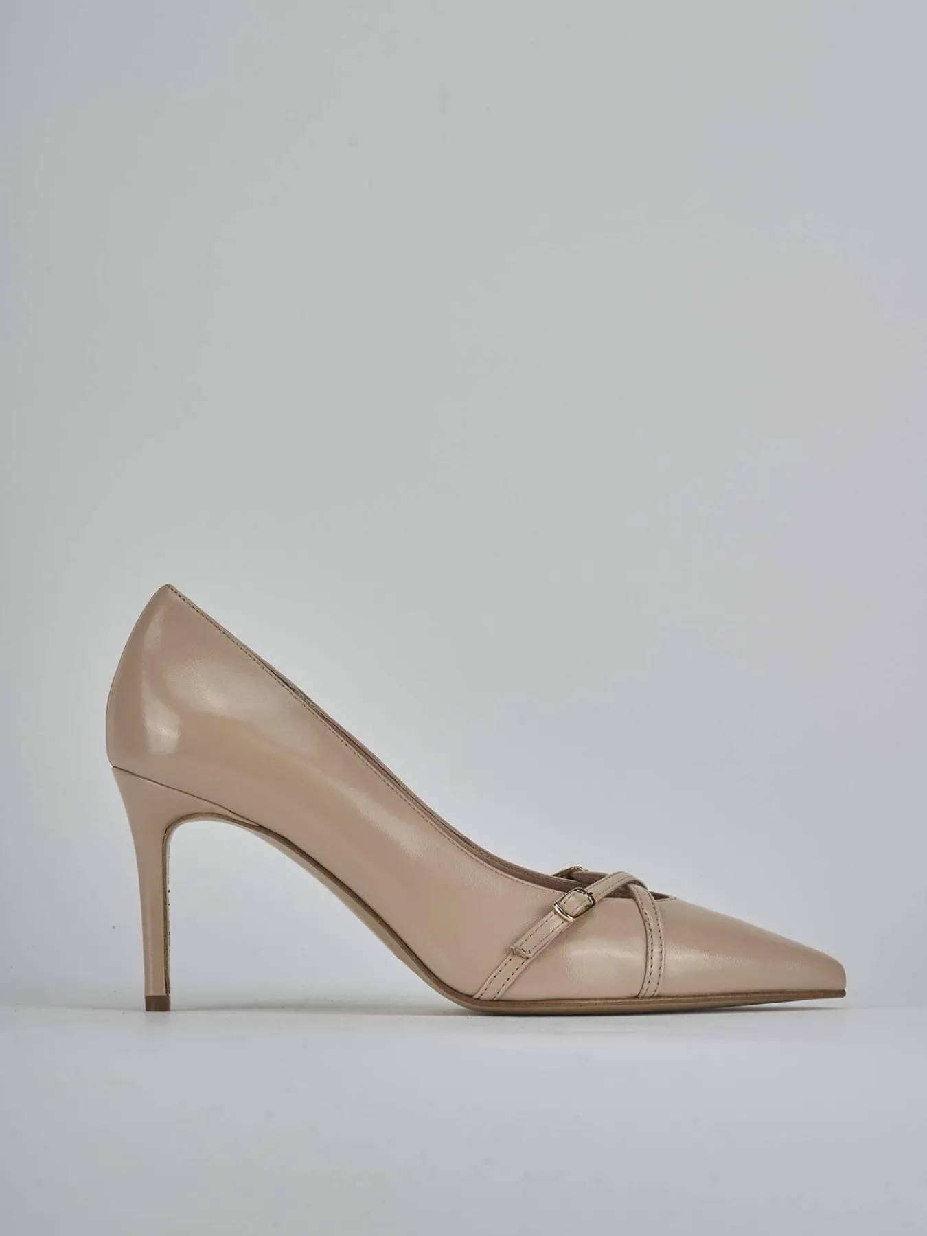 Decolte’ tacco 7 cm fondo in cuoio e soletto interno in vera pelle. Tomaiain morbida pelle effetto verniciato, punta sfilata, scollo stretto a ‘U’, due cinturini con fibbia regolabile incrociati sul collo del piede e tacco fino. Dal design ricercato per durare nel tempo.