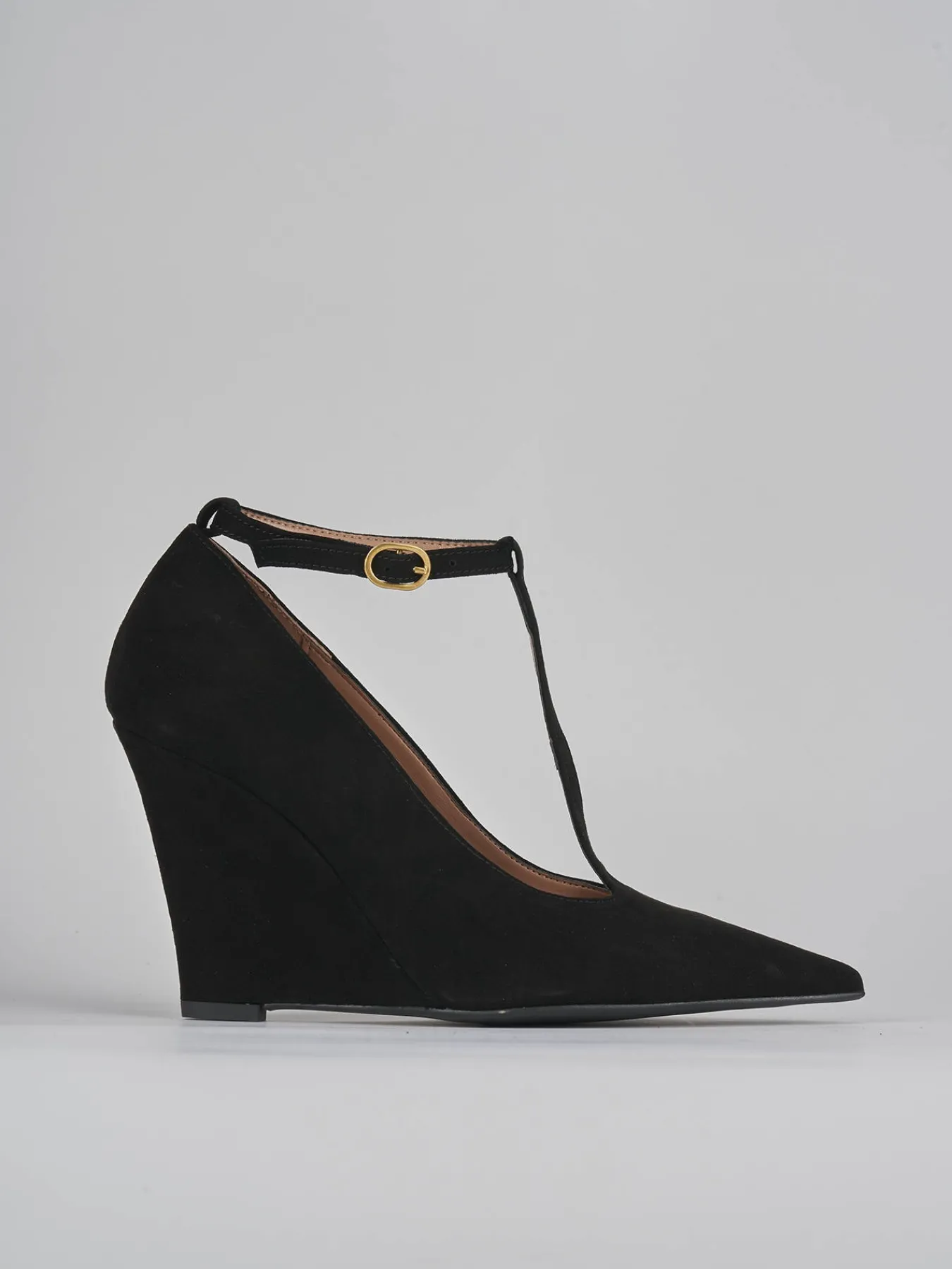bebe’ zeppa 9 cm fondo in leggera gomma e soletto interno in vera pelle. tomaia in morbido camoscio, punta sfilata, cinturino in caviglia regolabile e a ‘T’, zeppa per una calzata comoda. perfetto con un vestito o una minigonna e camicia.