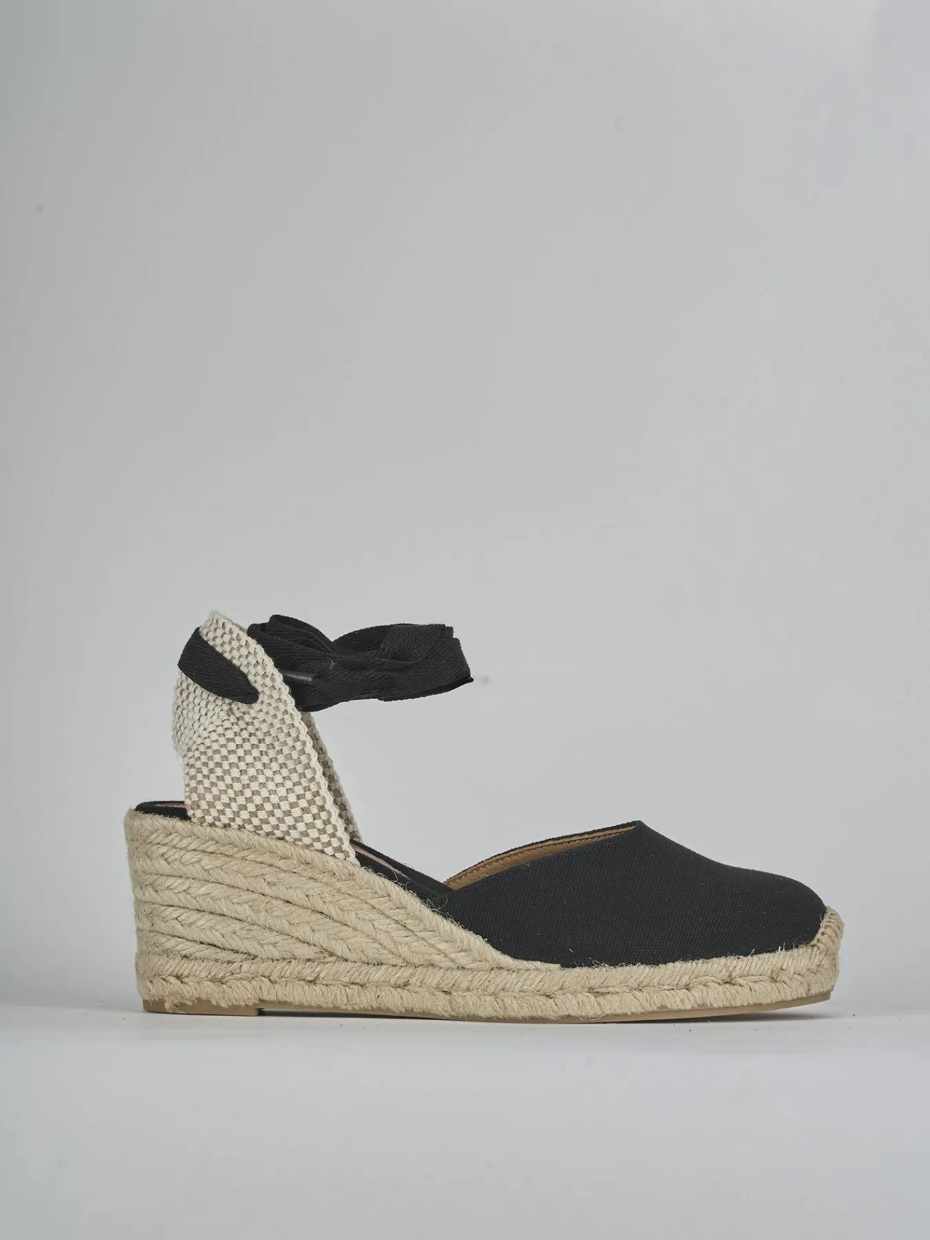 Espadrillas zeppa 6 cm fondo in leggera gomma e soletto interno in tessuto. tomaia in morbido tessuto, apertura a giro sul collo del piede, tallone chiuso e chiusura con nastro tessuto a schiava per un look chic!
