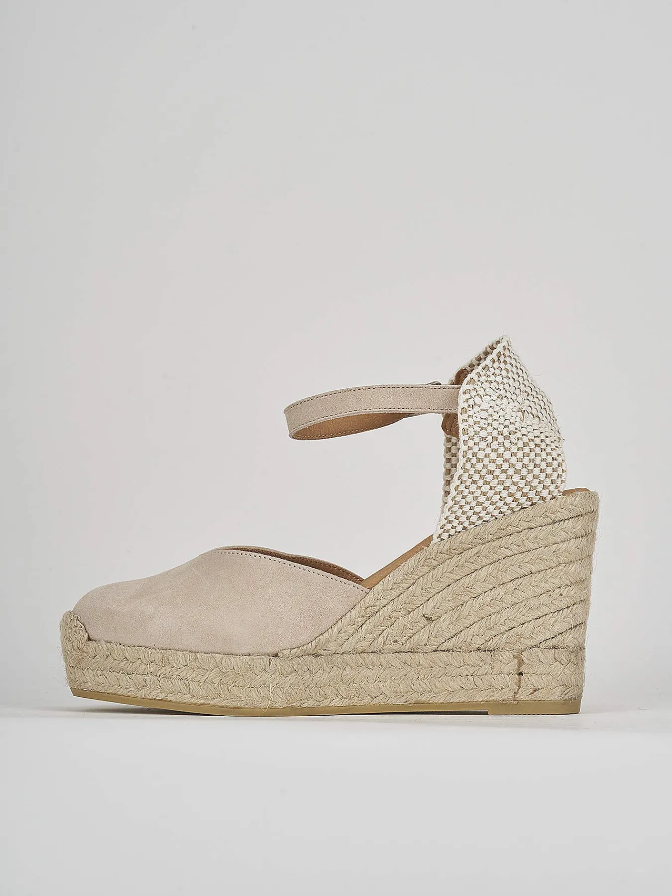espadrillas zeppa 9 cm fondo in leggerissima gomma e soletto interno in vera pelle. tomaia in morbido camoscio, scollo a ‘v’ in punta e chiusura con cinturino in caviglia per look fresco. Plato’ anteriore 2cm.