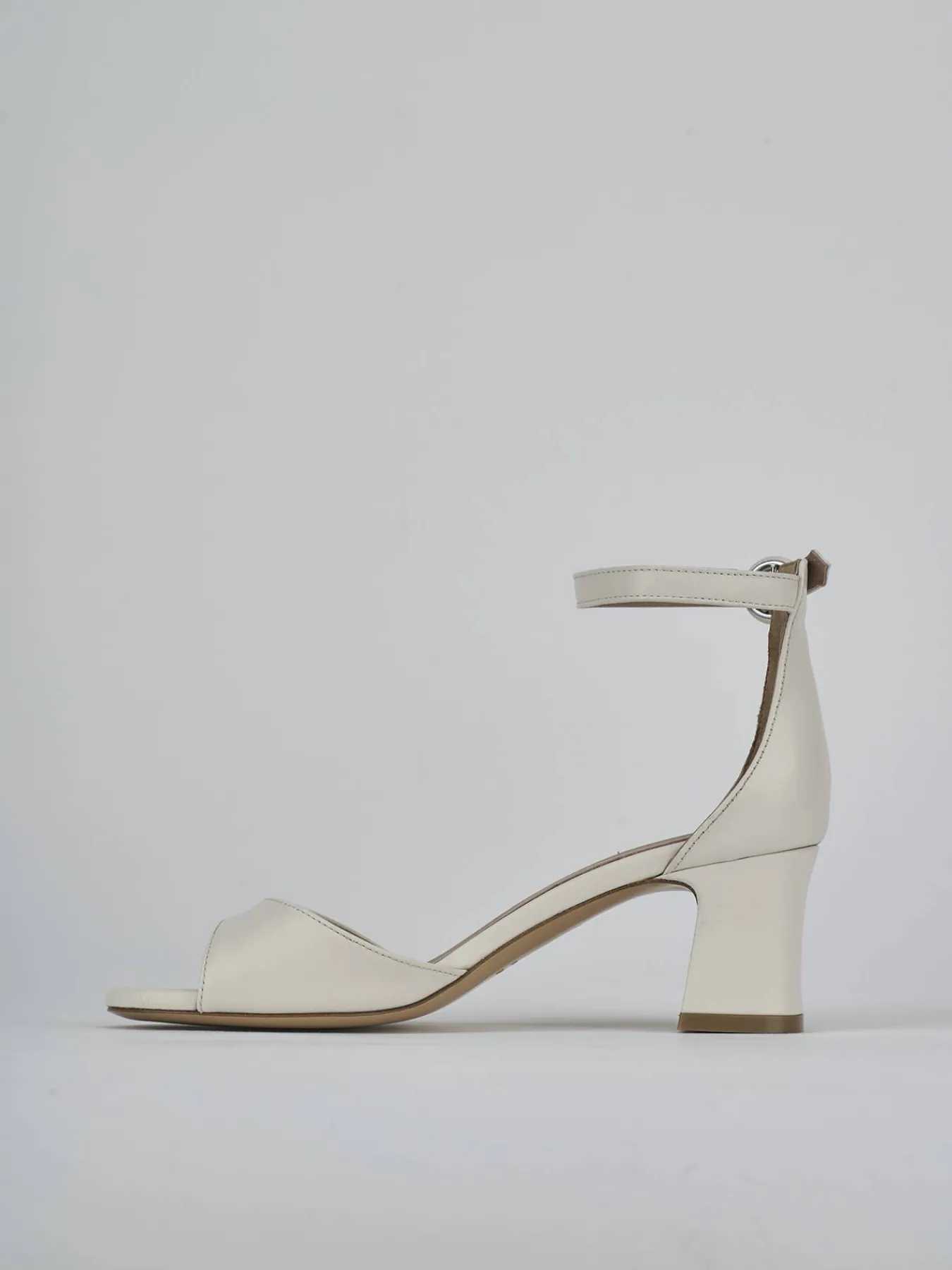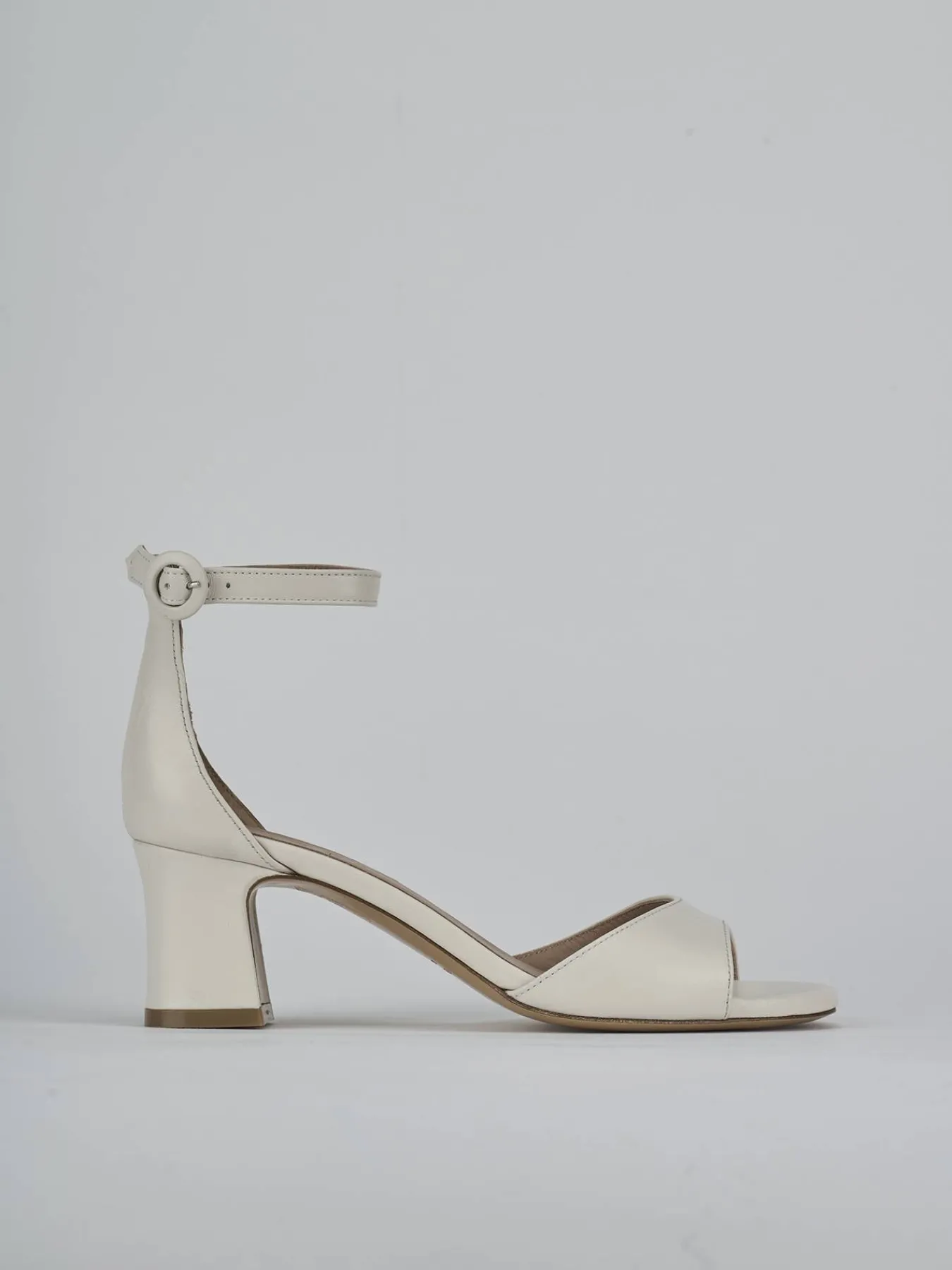 Sandalo tacco 5 cm fondo in cuoio e soletto interno in vera pelle. Tomaia in morbida pelle, punta affusolata, fascia unica in punta con taglio a mezza luna, cintuirno con fibbia regolabile in tinta e tacco grosso. Dal design che dura nel tempo.