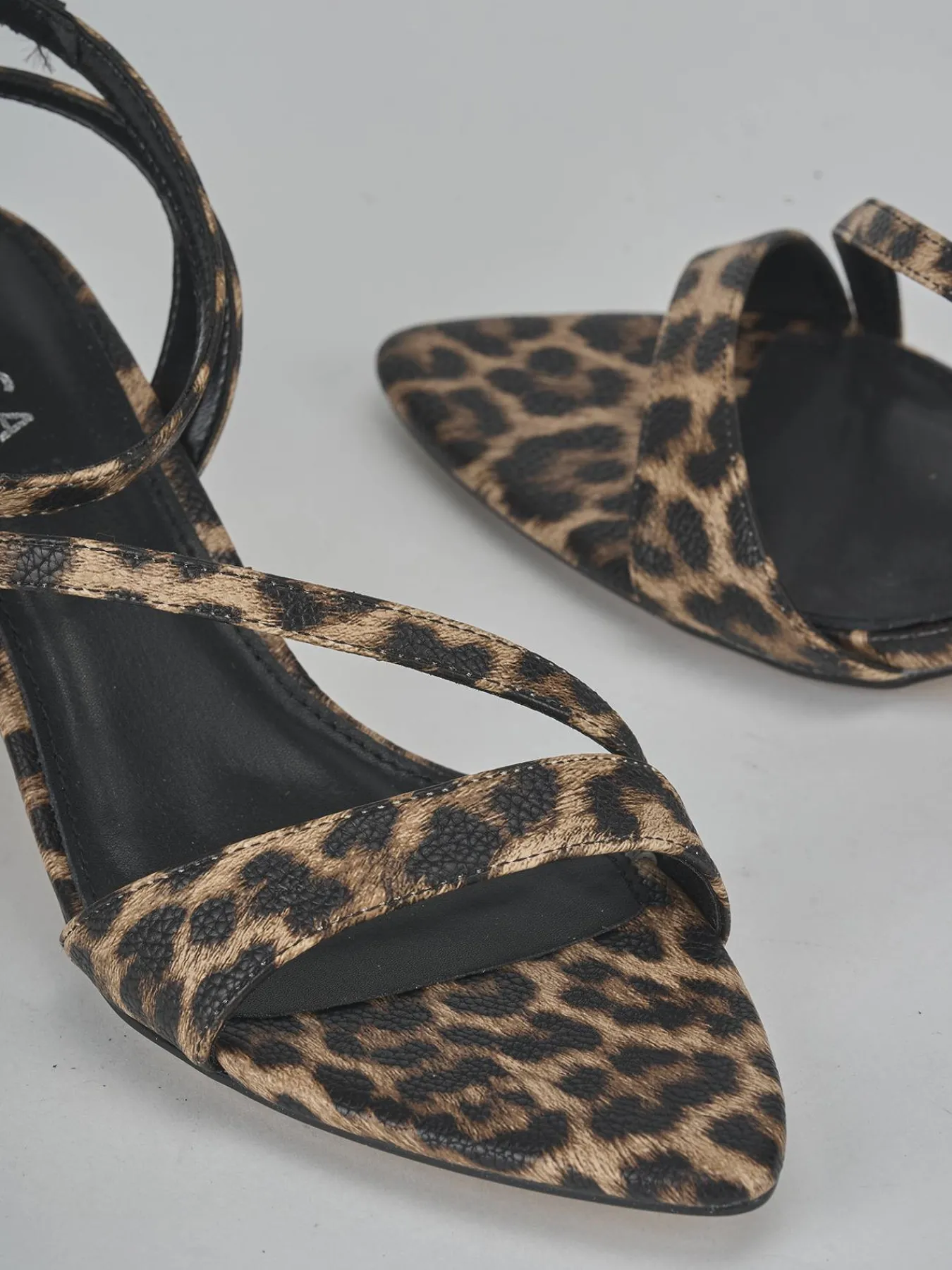 Sandalo tacco 5.5 cm fondo in leggera gomma e soletto interno in vera pelle. Tomaia in morbida pelle stampata effetto leopard, punta sfilata, fascette incrociate, cinturino in caviglia con fibbia regolabile e tacco rocchetto. Un twist cool per i tuoi look.