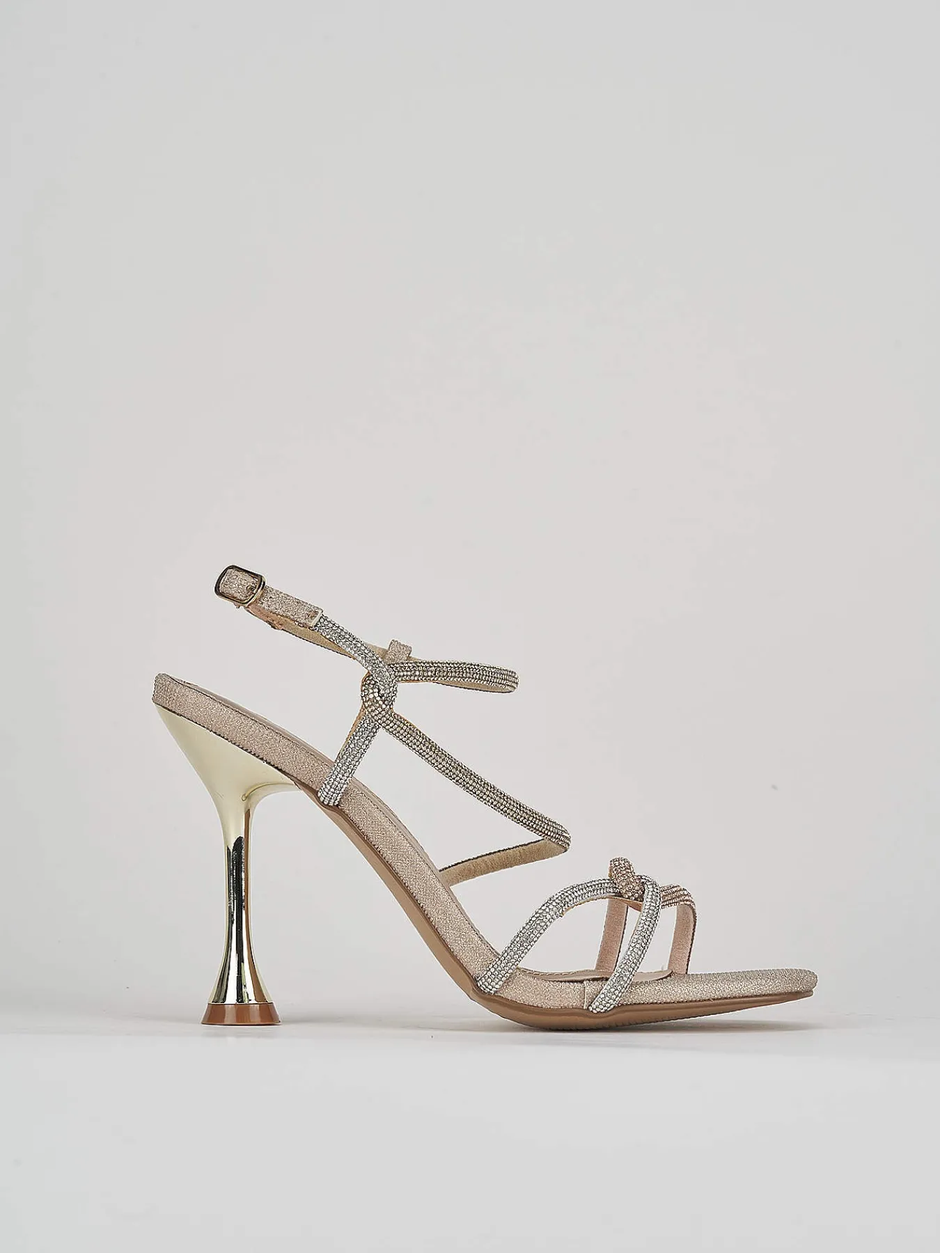 Sandalo tacco 9 cm fondo in legerissima gomma e soletto interno in vera pelle. Tomaia in morbida pelle glitterata, fascie intrecciate con nodo e strass colorati, tacco cilindrico e fibbia regolabile per una calzata perfetta, abbinate con un vestito per un tocco glamour al tuo look.