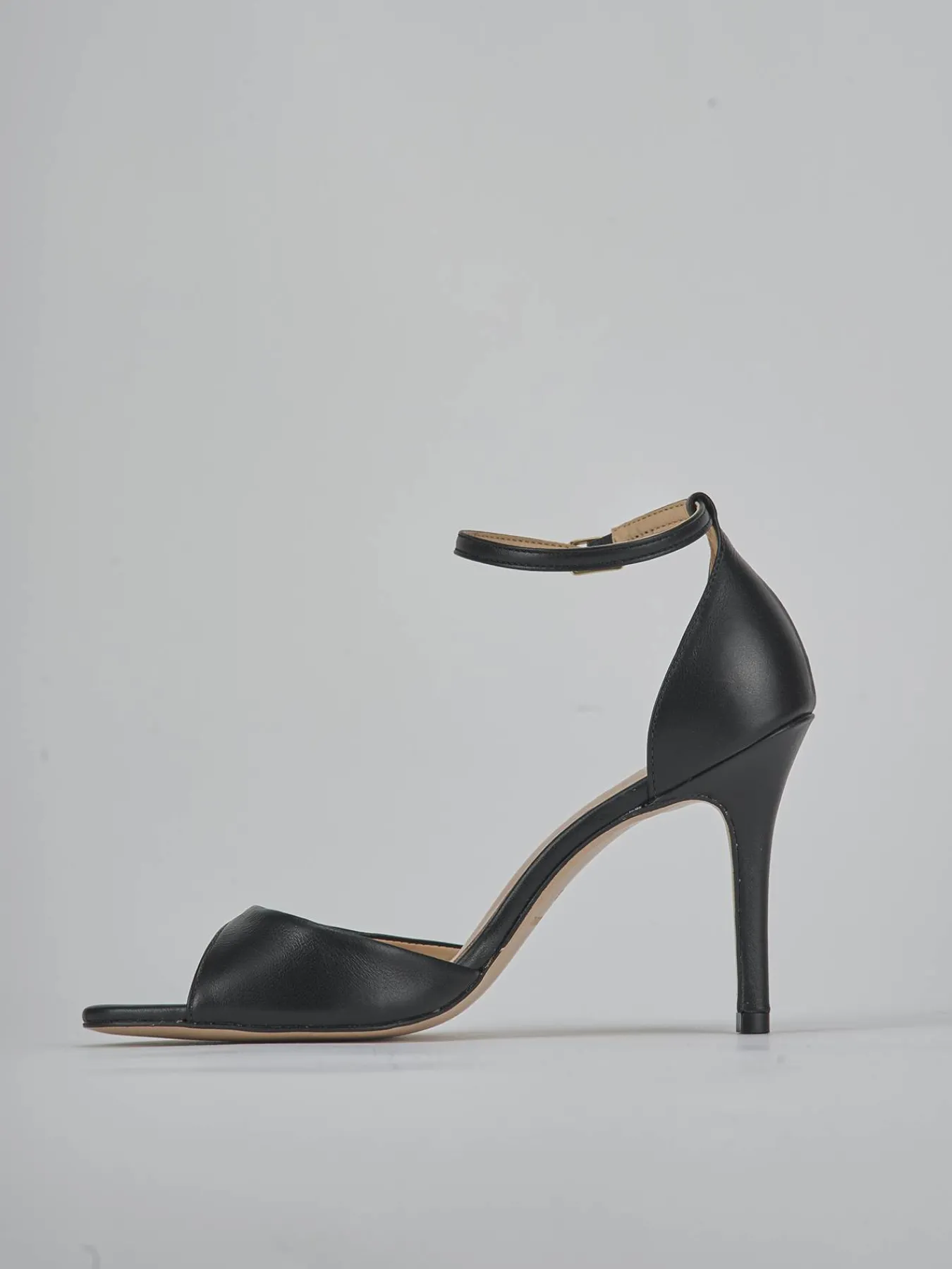 Sandalo tacco 9 cm fondo in leggerissima gomma e soletto interno in vera pelle. Tomaia in morbida pelle, punta affusolata, fascia unica, cinturino in caviglia con fibbia regolabile e tacco fino per un look cool.