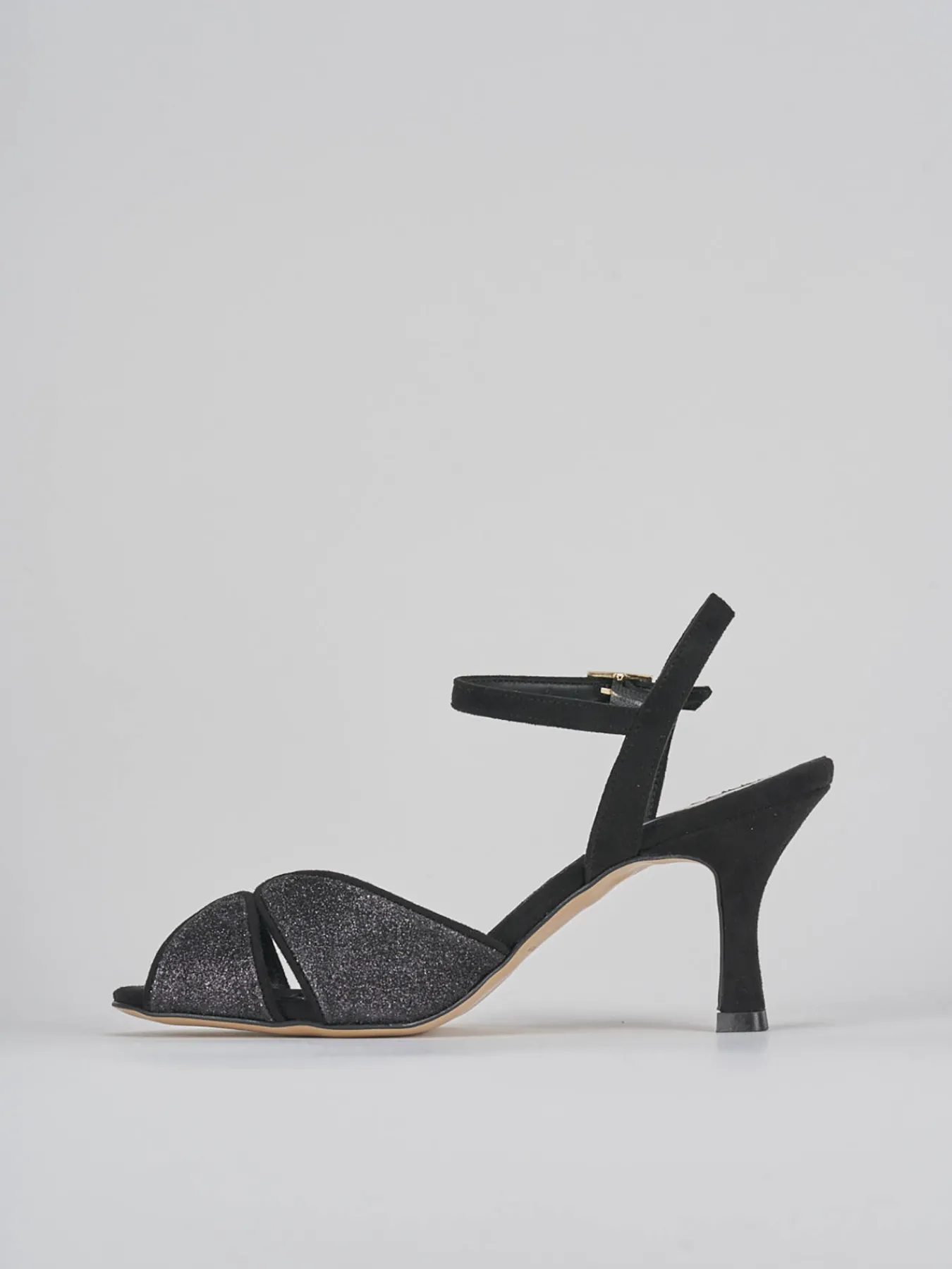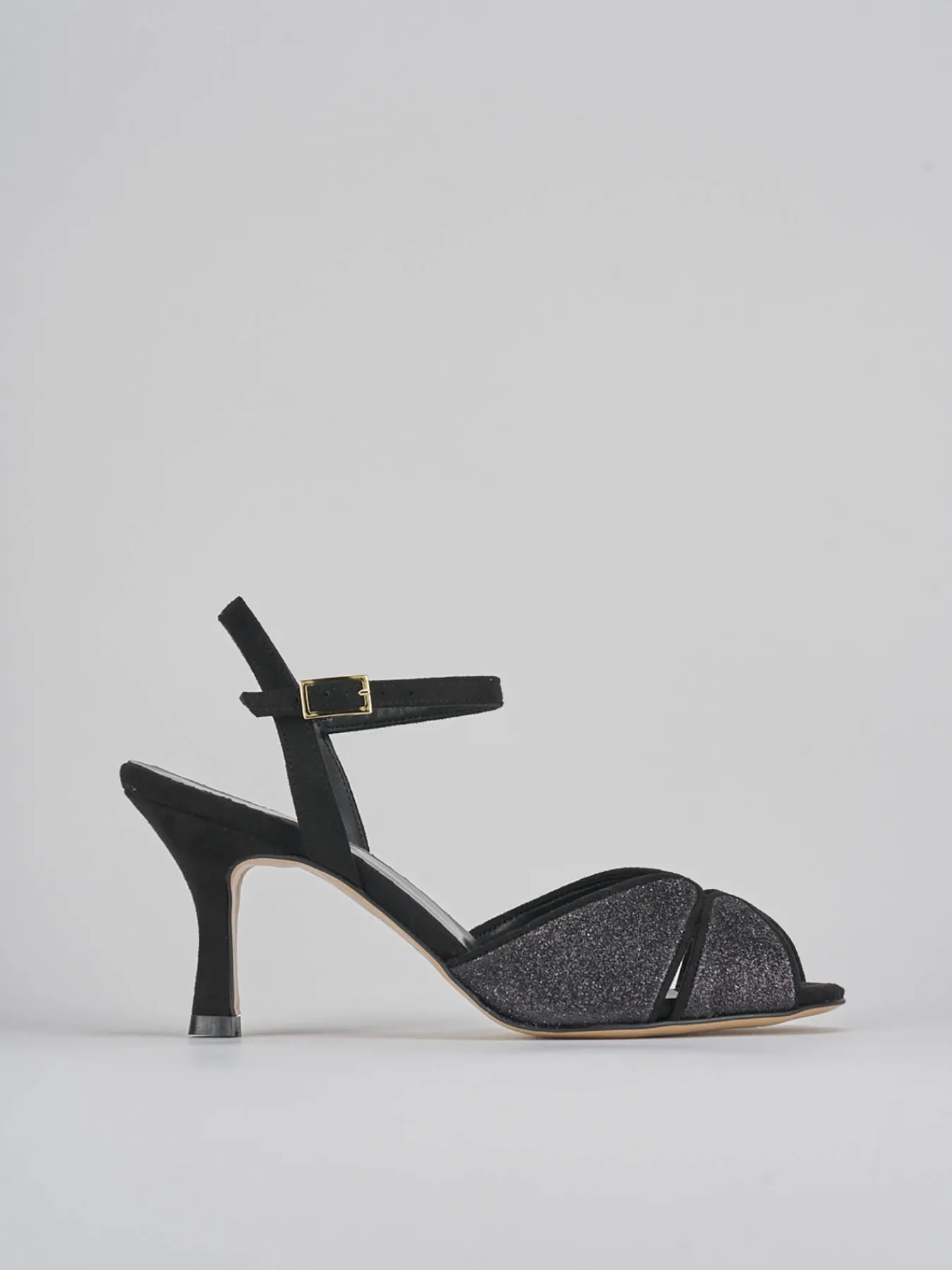 Sandalo tacco 7 cm, fondo in leggerissima gomma e soletto interno in vera pelle. Tomaia in morbida pelle foderata da tessuto glitterato, fascia unica intrecciata in punta, cinturino in caviglia con fibia regolabile e tallone aperto, per ogni tua serata.