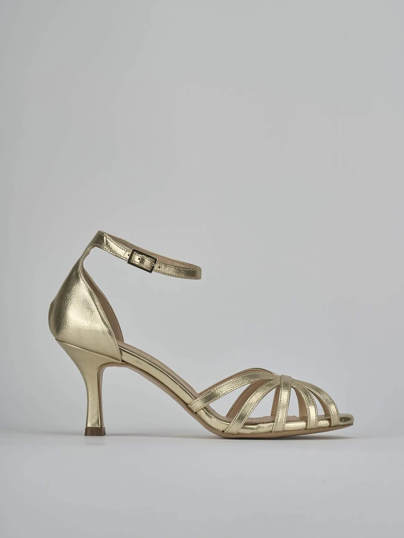 Sandalo tacco 7 cm, fondo in leggerissima gomma e soletto interno in vera pelle. Tomaia in morbida nappa effetto laminato, punta affusolata con fascia a cestina aperta in punta, cinturino in caviglia con fibbia regolabile e tallone chiuso. per un look so-cool!