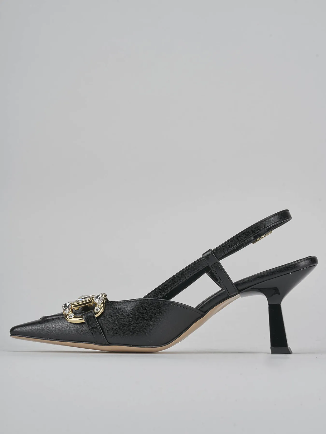 Slingback tacco 7 cm fondo in leggerissima gomma e soletto interno in vera pelle. Tomaia in morbida pelle, punta sfilata, scollo squadrato, cuciture a mano visibili, morsetto con pietre chiare e cinturino con fibbia regoalbile. Nuovissimo tacco rocchetto in materiale abs per un look cool.
