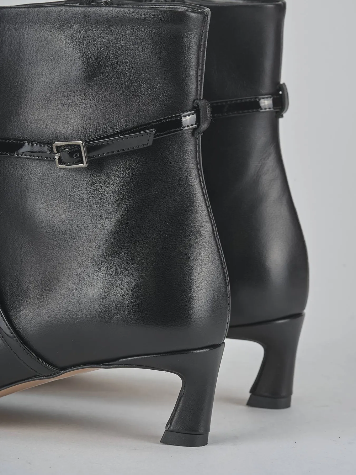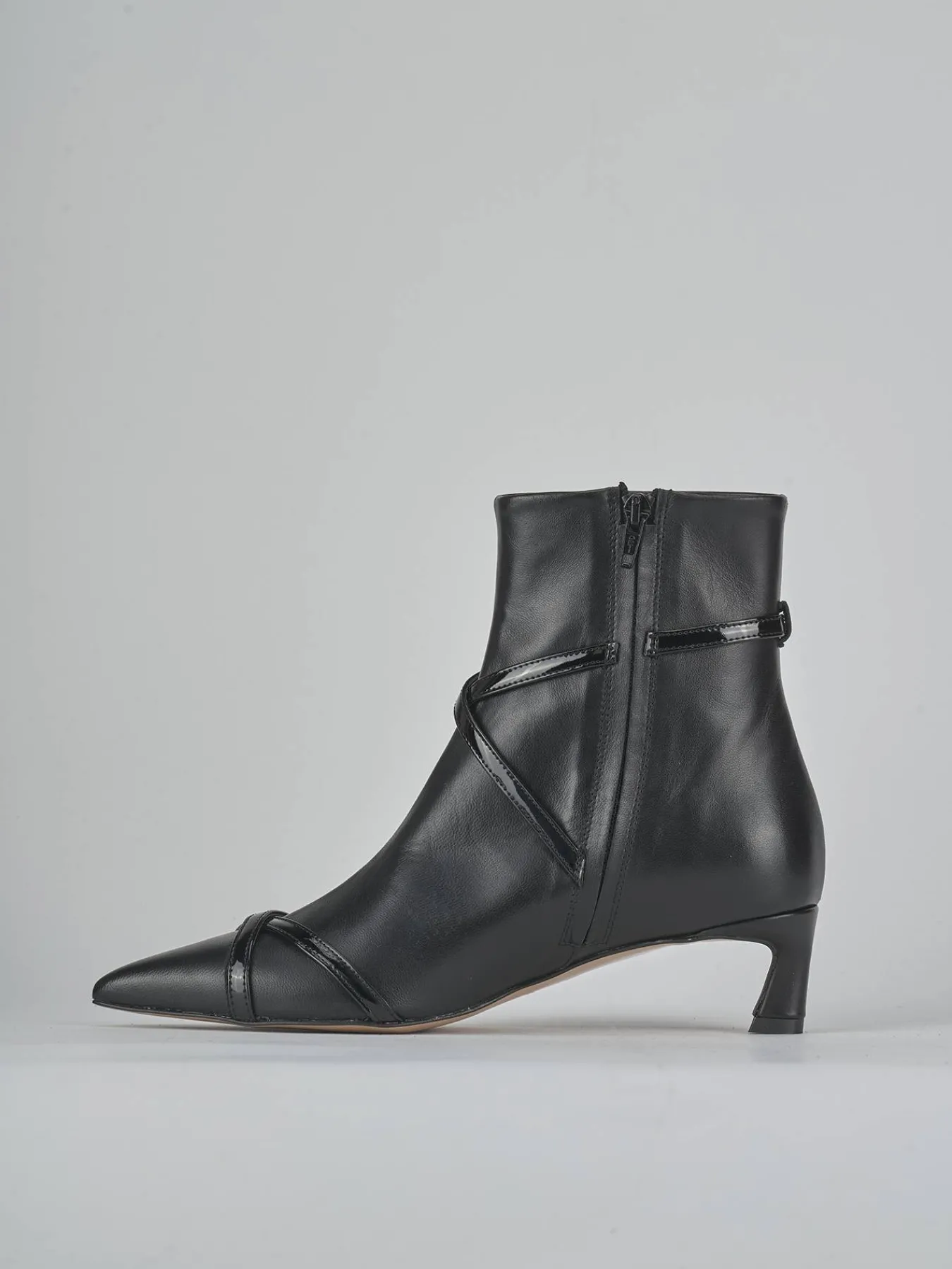 Due cinturini in pelle effetto verniciato, incrociati con fibbia regolabile, aggiungono un tocco di modernità e stile.